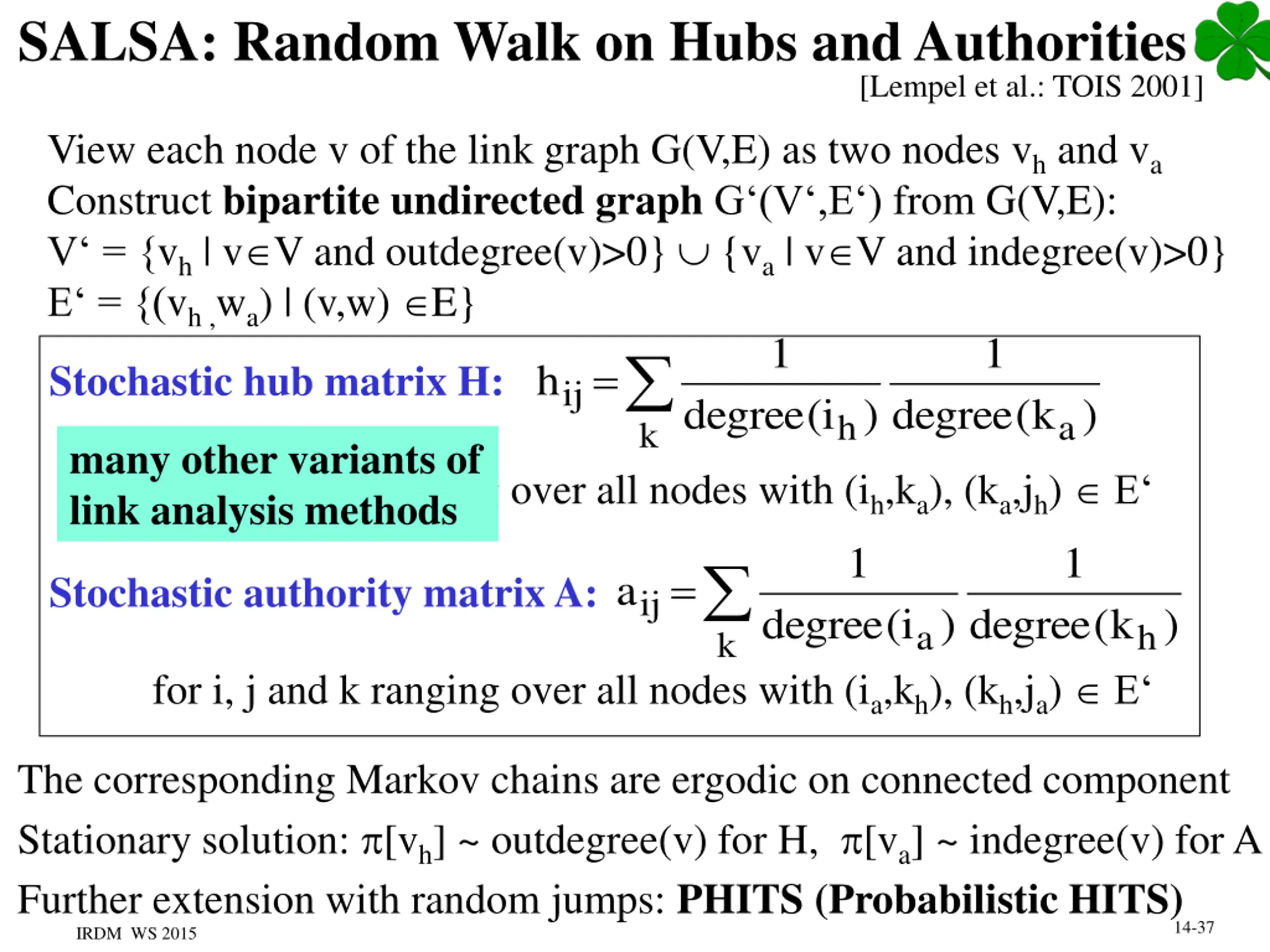 SALSA: Random Walk on Hubs and Authorities [Lempel et al.: TOIS 2001] View each node v of the link graph G(V,E) as two nodes vh and va Construct bipartite undirected graphG (V ,E ) from G(V,E): V = {vh | v V and outdegree(v)>0} {va | v V and indegree(v)>0} E = {(vh ,wa) | (v,w) E} ij many other variants of link analysis methods 1 1 = Stochastic hub matrix H: h degree i ( ) degree k ( ) h a k for i, j and k ranging over all nodes with (ih,ka), (ka,jh) E 1 1 ij = a Stochastic authority matrix A: degree i ( ) degree k ( ) a h k for i, j and k ranging over all nodes with (ia,kh), (kh,ja) E The corresponding Markov chains are ergodic on connected component Stationary solution: [vh] ~ outdegree(v) for H, [va] ~ indegree(v) for A Further extension with random jumps: PHITS (Probabilistic HITS) 14-37 IRDM WS 2015