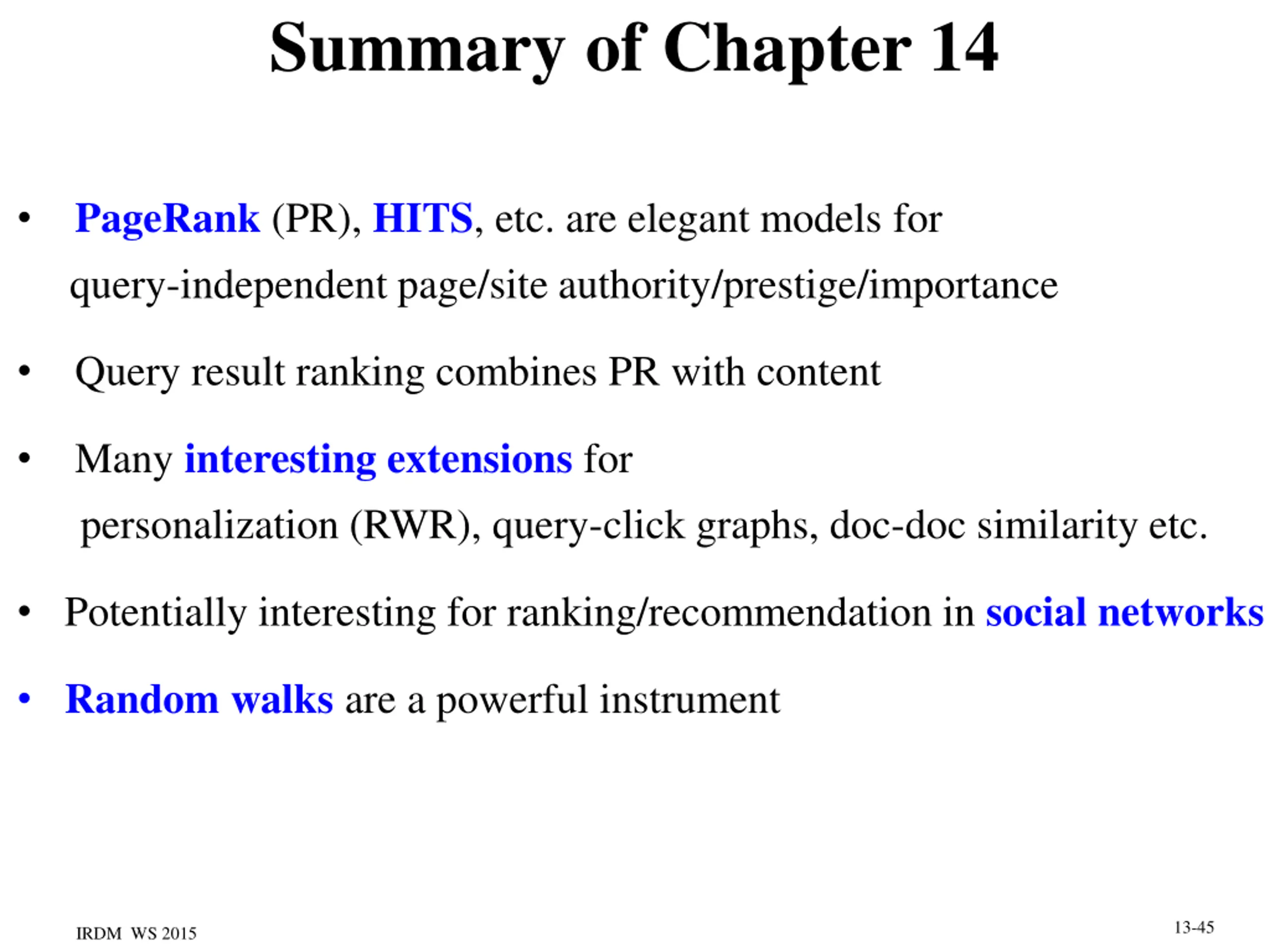 Summary of Chapter 14 PageRank (PR), HITS, etc. are elegant models for query-independent page/site authority/prestige/importance Query result ranking combines PR with content Many interesting extensions for personalization (RWR), query-click graphs, doc-doc similarity etc. Potentially interesting for ranking/recommendation in social networks Random walks are a powerful instrument 13-45 IRDM WS 2015