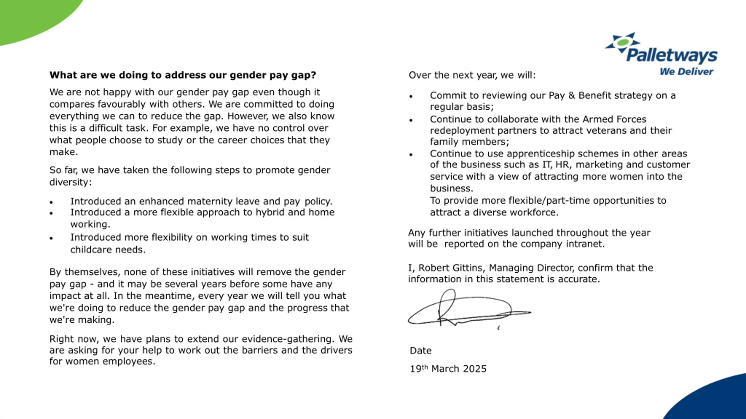 What are we doing to address our gender pay gap? Over the next year, we will: We are not happy with our gender pay gap even though it compares favourably with others. We are committed to doing everything we can to reduce the gap. However, we also know this is a difficult task. For example, we have no control over what people choose to study or the career choices that they make. Commit to reviewing our Pay & Benefit strategy on a regular basis; Continue to collaborate with the Armed Forces redeployment partners to attract veterans and their family members; Continue to use apprenticeship schemes in other areas of the business such as IT, HR, marketing and customer service with a view of attracting more women into the business. To provide more flexible/part-time opportunities to attract a diverse workforce. So far, we have taken the following steps to promote gender diversity: Introduced an enhanced maternity leave and pay policy. Introduced a more flexible approach to hybrid and home working. Introduced more flexibility on working times to suit childcare needs. Any further initiatives launched throughout the year will be reported on the company intranet. I, Robert Gittins, Managing Director, confirm that the information in this statement is accurate. By themselves, none of these initiatives will remove the gender pay gap - and it may be several years before some have any impact at all. In the meantime, every year we will tell you what we're doing to reduce the gender pay gap and the progress that we're making. Signed Right now, we have plans to extend our evidence-gathering. We are asking for your help to work out the barriers and the drivers for women employees. Date 19th March 2025