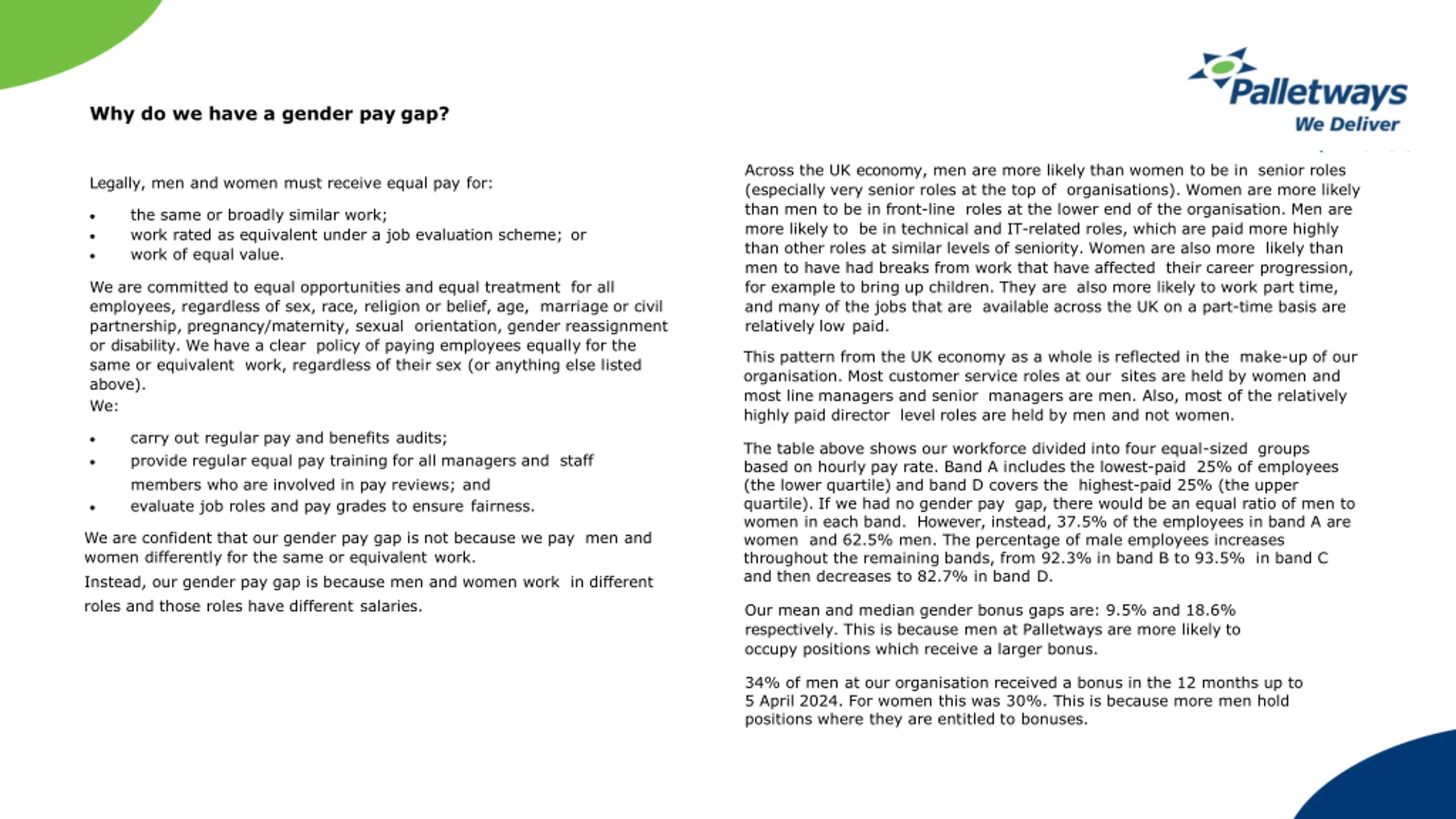Why do we have a gender pay gap? Across the UK economy, men are more likely than women to be in senior roles (especially very senior roles at the top of organisations). Women are more likely than men to be in front-line roles at the lower end of the organisation. Men are more likely to be in technical and IT-related roles, which are paid more highly than other roles at similar levels of seniority. Women are also more likely than men to have had breaks from work that have affected their career progression, for example to bring up children. They are also more likely to work part time, and many of the jobs that are available across the UK on a part-time basis are relatively low paid. Legally, men and women must receive equal pay for: the same or broadly similar work; work rated as equivalent under a job evaluation scheme; or work of equal value. We are committed to equal opportunities and equal treatment for all employees, regardless of sex, race, religion or belief, age, marriage or civil partnership, pregnancy/maternity, sexual orientation, gender reassignment or disability. We have a clear policy of paying employees equally for the same or equivalent work, regardless of their sex (or anything else listed above). We: This pattern from the UK economy as a whole is reflected in the make-up of our organisation. Most customer service roles at our sites are held by women and most line managers and senior managers are men. Also, most of the relatively highly paid director level roles are held by men and not women. carry out regular pay and benefits audits; provide regular equal pay training for all managers and staff members who are involved in pay reviews; and evaluate job roles and pay grades to ensure fairness. The table above shows our workforce divided into four equal-sized groups based on hourly pay rate. Band A includes the lowest-paid 25% of employees (the lower quartile) and band D covers the highest-paid 25% (the upper quartile). If we had no gender pay gap, there would be an equal ratio of men to women in each band. However, instead, 37.5% of the employees in band A are women and 62.5% men. The percentage of male employees increases throughout the remaining bands, from 92.3% in band B to 93.5% in band C and then decreases to 82.7% in band D. We are confident that our gender pay gap is not because we pay men and women differently for the same or equivalent work. Instead, our gender pay gap is because men and women work in different roles and those roles have different salaries. Our mean and median gender bonus gaps are: 9.5% and 18.6% respectively. This is because men at Palletways are more likely to occupy positions which receive a larger bonus. 34% of men at our organisation received a bonus in the 12 months up to 5 April 2024. For women this was 30%. This is because more men hold positions where they are entitled to bonuses.