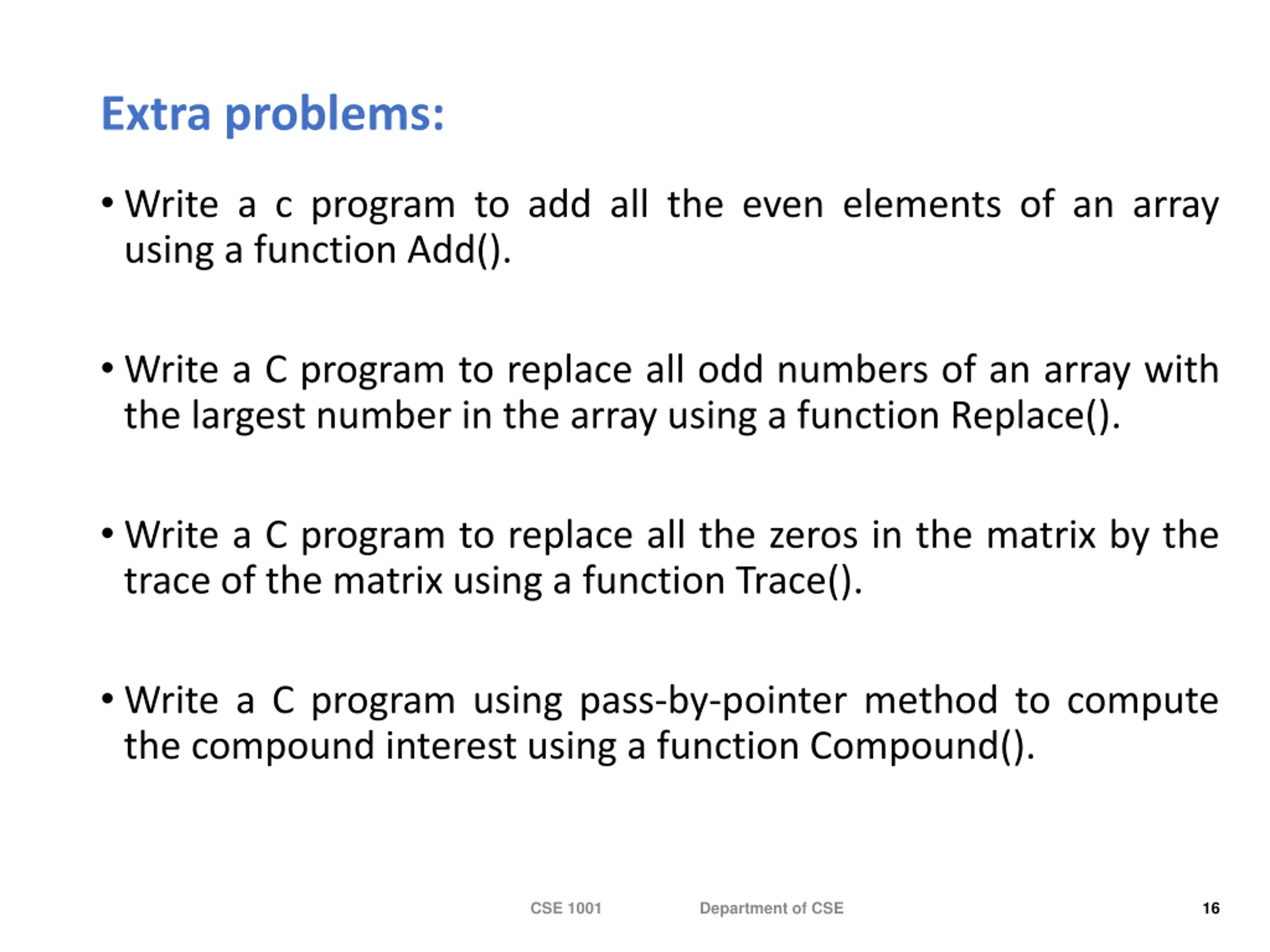 Extra problems: Write a c program to add all the even elements of an array using a function Add(). Write a C program to replace all odd numbers of an array with the largest number in the array using a function Replace(). Write a C program to replace all the zeros in the matrix by the trace of the matrix using a function Trace(). Write a C program using pass-by-pointer method to compute the compound interest using a function Compound(). CSE 1001 Department of CSE 16