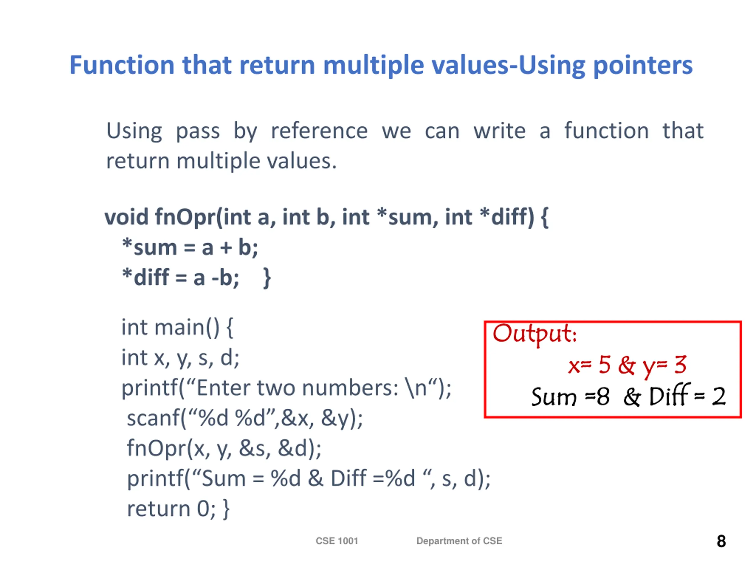 Function that return multiple values-Using pointers Using pass by reference we can write a function that return multiple values. void fnOpr(int a, int b, int *sum, int *diff) { *sum = a + b; *diff = a -b; } int main() { int x, y, s, d; printf( Enter two numbers: \n ); scanf( %d %d ,&x, &y); fnOpr(x, y, &s, &d); printf( Sum = %d & Diff =%d , s, d); return 0; } Output Output: : Sum Sum = =8 8 & & Diff x= x= 5 5 & & y= y= 3 3 Diff = = 2 2 8 CSE 1001 Department of CSE