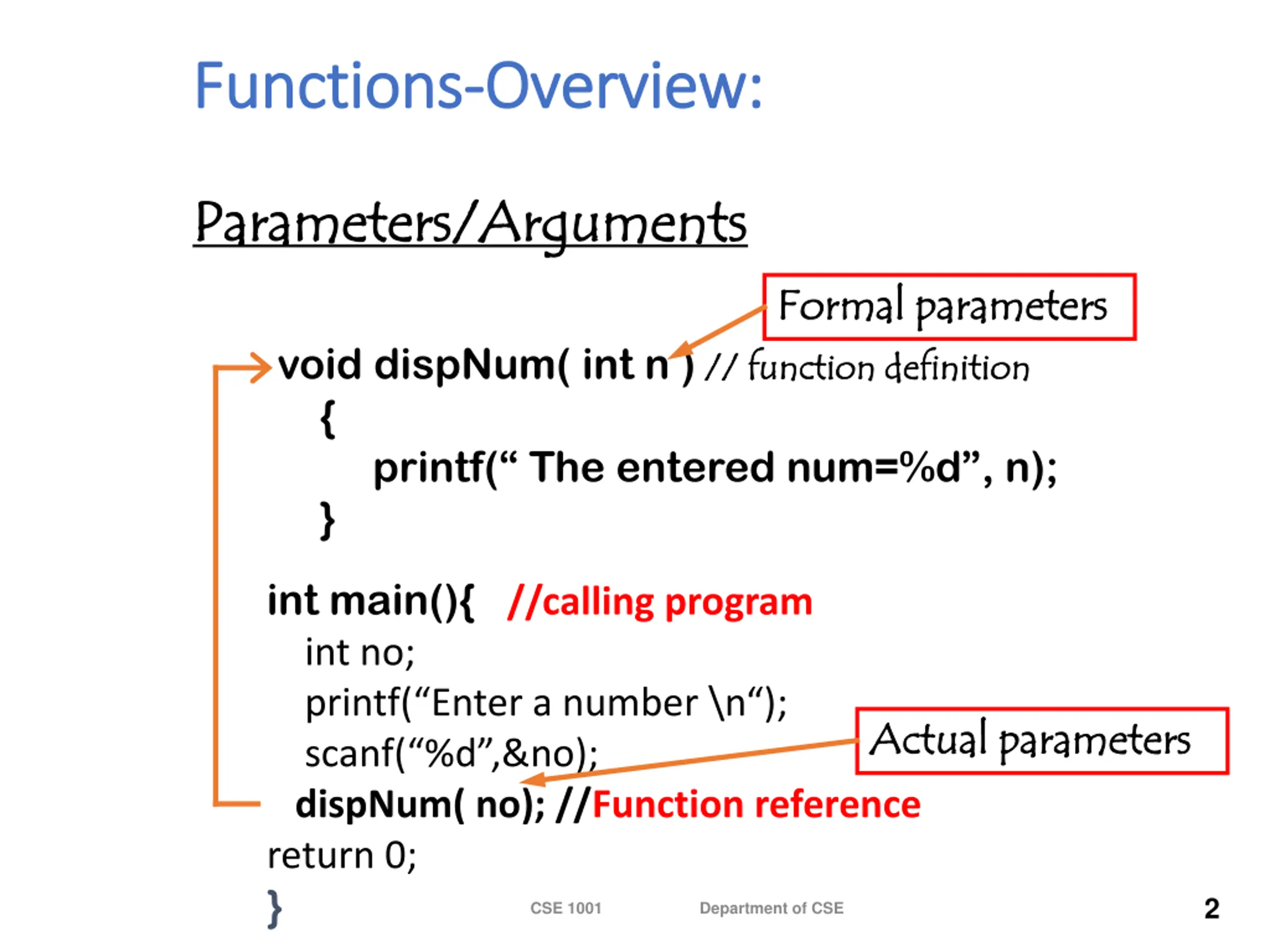 Functions Functions- -Overview: Overview: Parameters/Arguments Parameters/Arguments Formal parameters Formal parameters void dispNum( int n )// function definition { printf( The entered num=%d , n); } // function definition int main(){ //calling program int no; printf( Enter a number \n ); scanf( %d ,&no); dispNum( no); //Function reference return 0; } Actual parameters Actual parameters 2 CSE 1001 Department of CSE