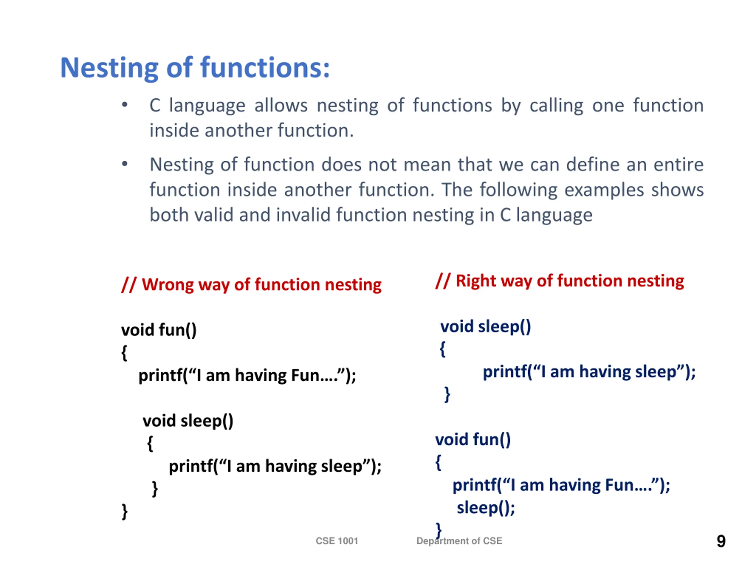 Nesting of functions: C language allows nesting of functions by calling one function inside another function. Nesting of function does not mean that we can define an entire function inside another function. The following examples shows both valid and invalid function nesting in C language // Right way of function nesting // Wrong way of function nesting void sleep() { printf( I am having sleep ); } void fun() { printf( I am having Fun . ); void sleep() { printf( I am having sleep ); } } void fun() { printf( I am having Fun . ); sleep(); } 9 CSE 1001 Department of CSE