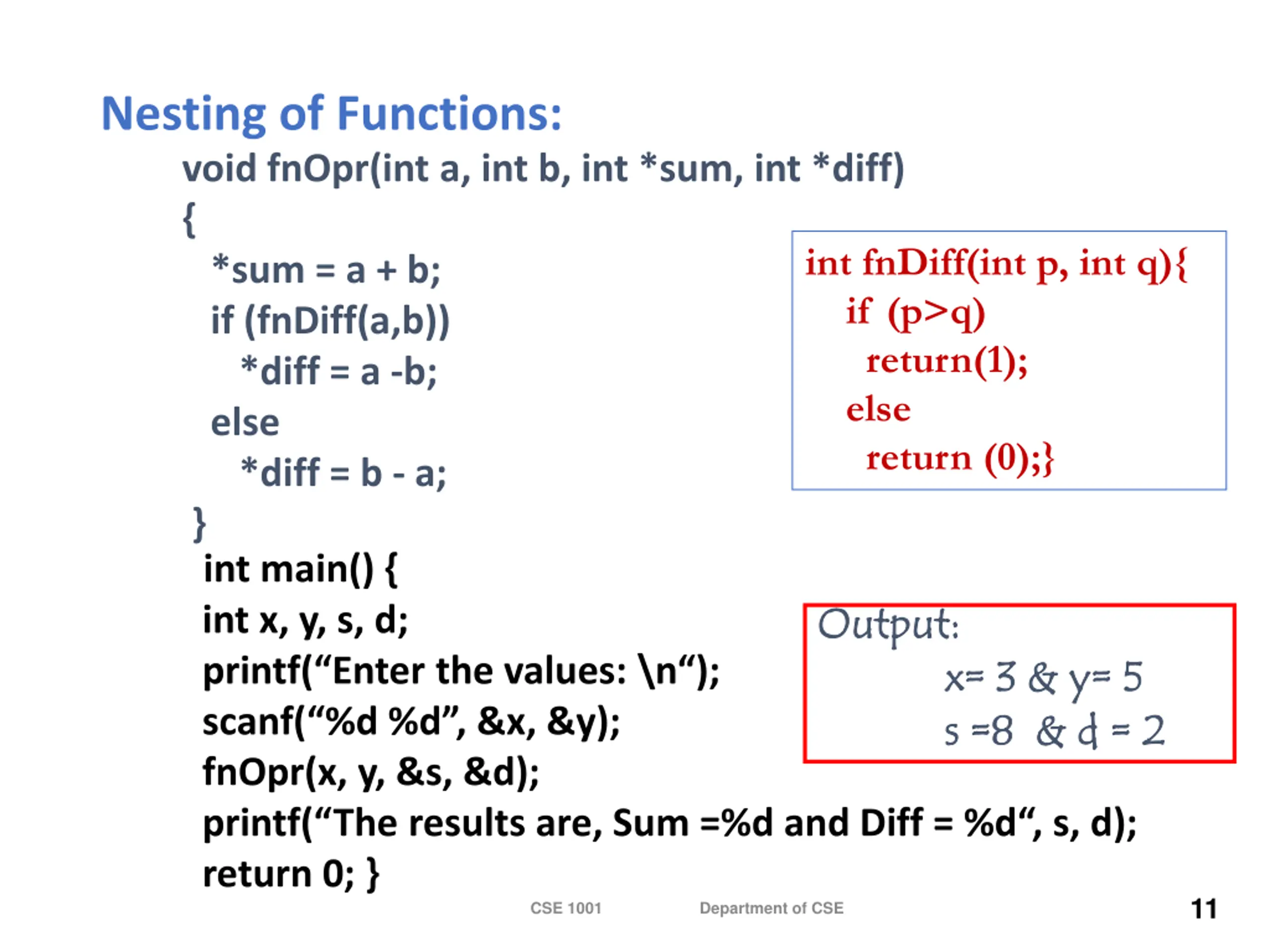Nesting of Functions: void fnOpr(int a, int b, int *sum, int *diff) { *sum = a + b; if (fnDiff(a,b)) *diff = a -b; else *diff = b - a; } int fnDiff(int p, int q){ if (p>q) return(1); else return (0);} int main() { int x, y, s, d; printf( Enter the values: \n ); scanf( %d %d , &x, &y); fnOpr(x, y, &s, &d); printf( The results are, Sum =%d and Diff = %d , s, d); return 0; } Output Output: : x= x= 3 3 & & y= s s = =8 8 & & d d = = 2 2 y= 5 5 11 CSE 1001 Department of CSE