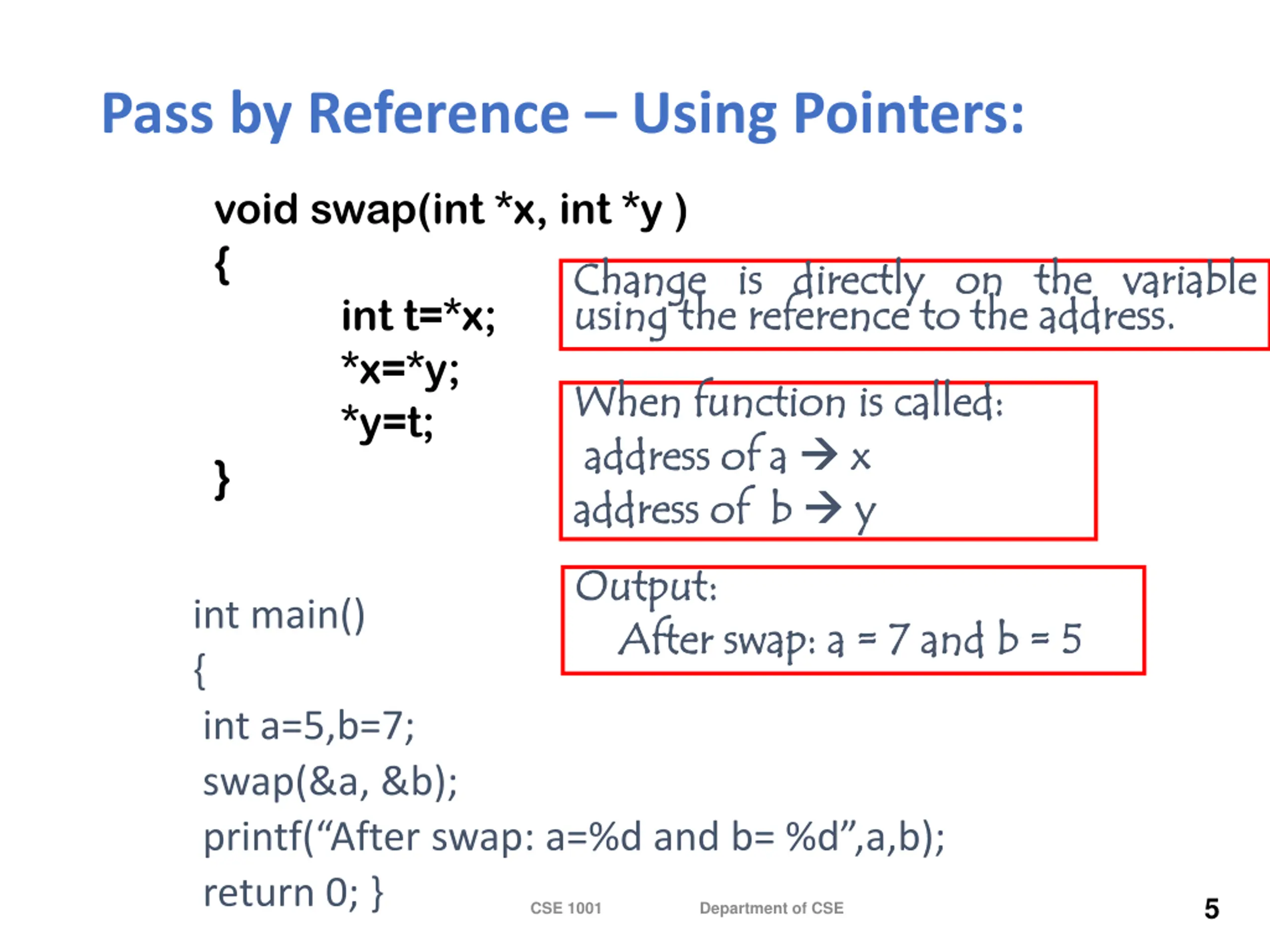 Pass by value: void swap(int x, int y ) { int t=x; x=y; y=t; printf( In fn: x= %d and y=%d ,x,y); } Output: In fn: x = 7 & y = 5 After swap: a = 5 & b = 7 int main() { int a=5,b=7; swap(a, b); printf( After swap: a= %d and b= %d ,a,b); return 0; } 4 CSE 1001 Department of CSE