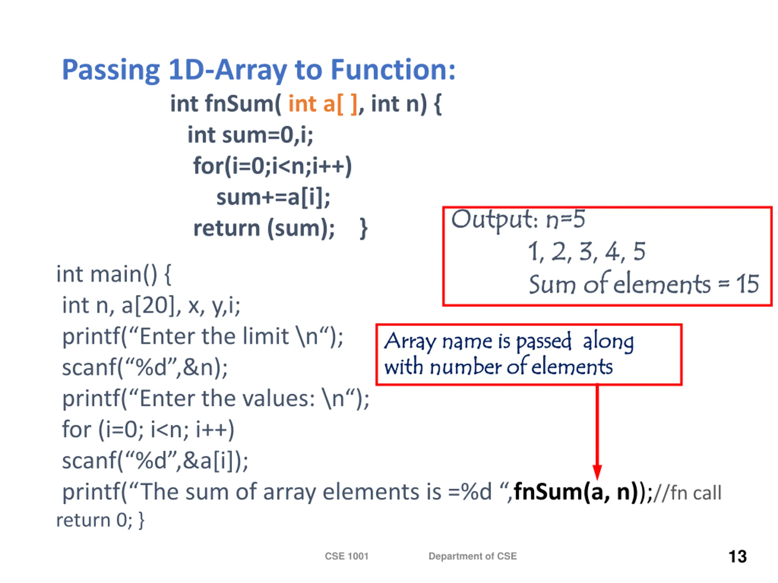 Passing 1D-Array to Function Rules to pass an array to a function The function must be called by passing only the name of the array. In the function definition, the formal parameter must be an array type; the size of the array does not need to be specified. The function prototype must show that argument is an array. 12 CSE 1001 Department of CSE