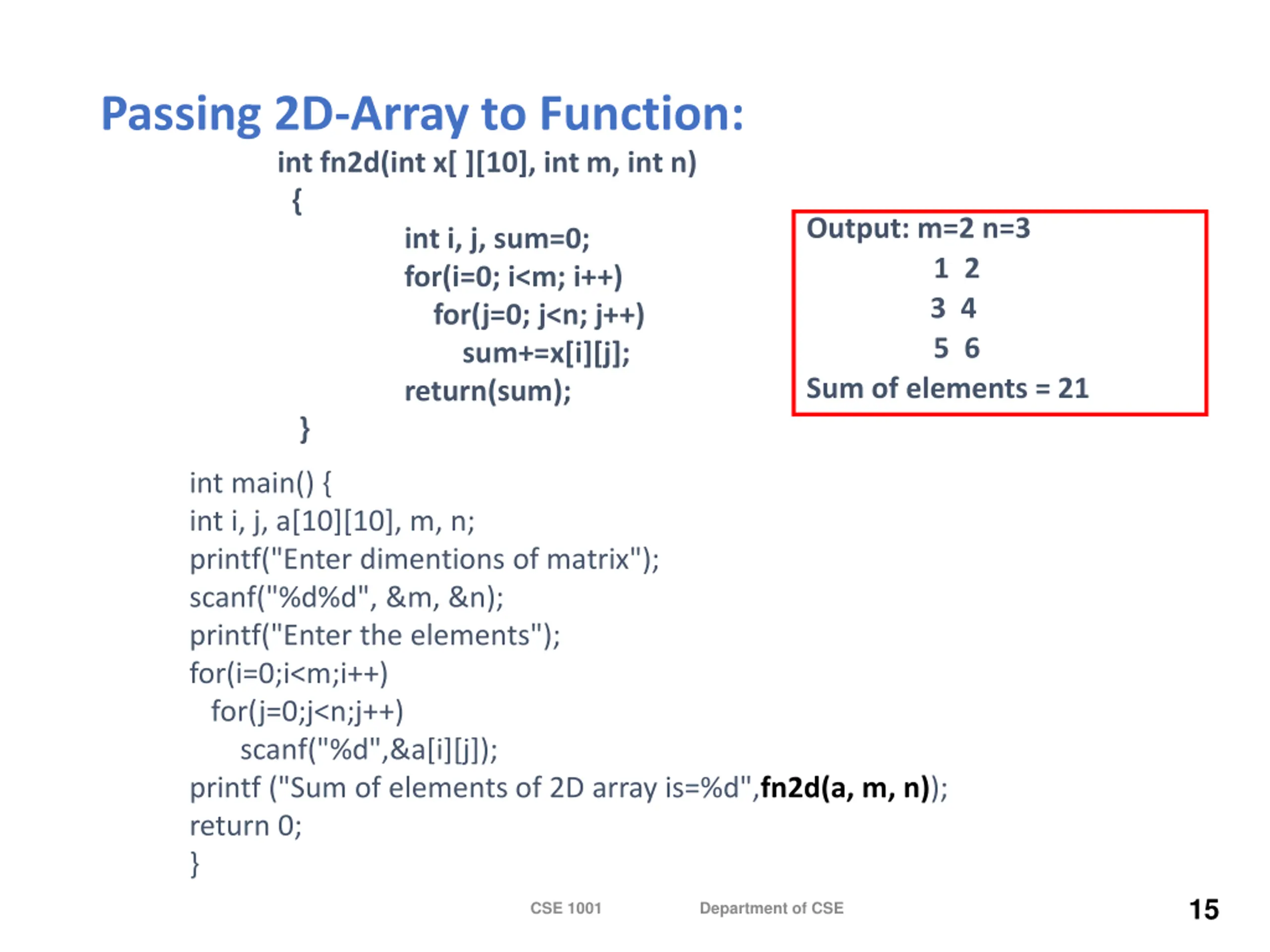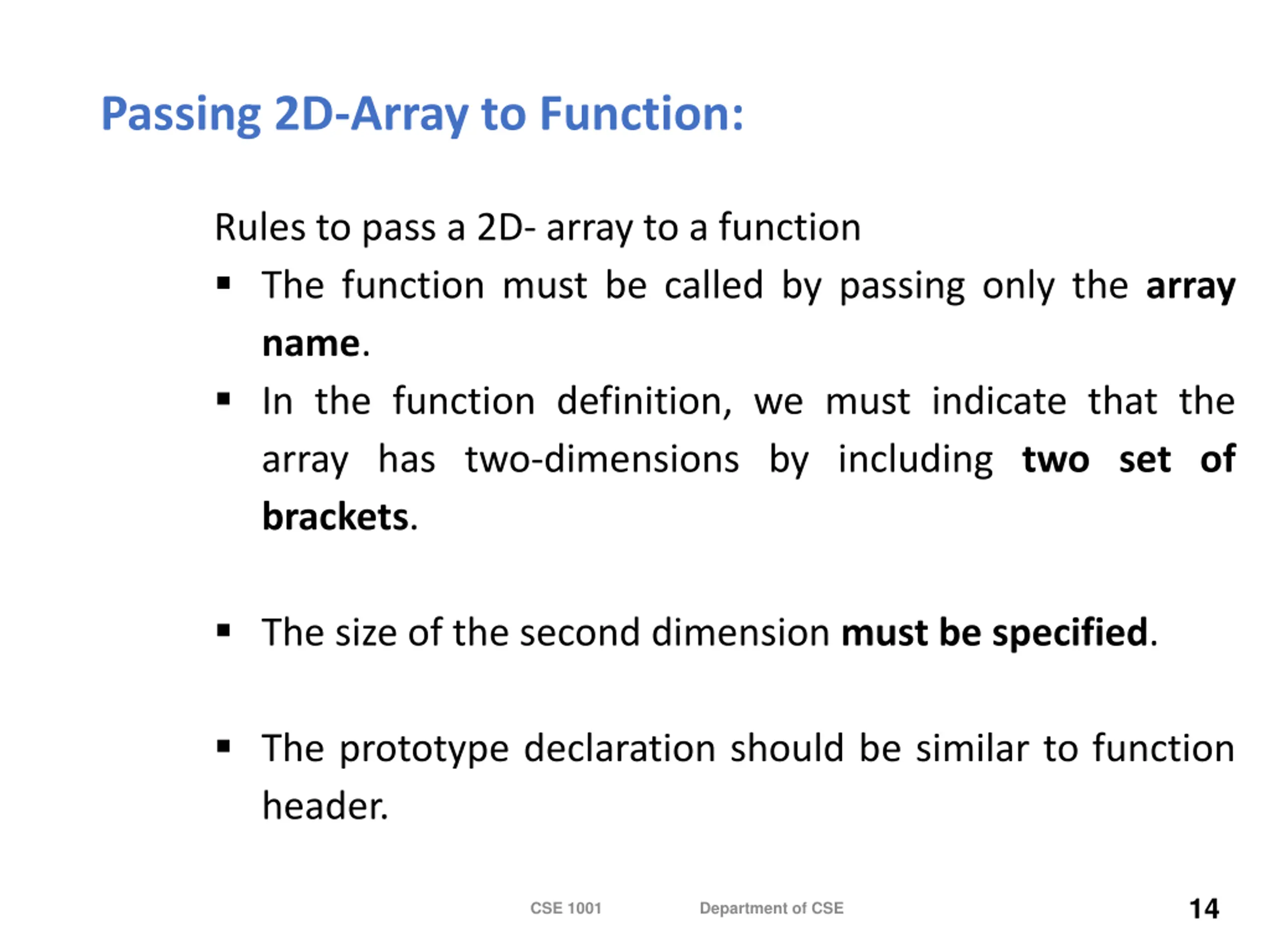 Passing 2D-Array to Function: Rules to pass a 2D- array to a function The function must be called by passing only the array name. In the function definition, we must indicate that the array has two-dimensions by including two set of brackets. The size of the second dimension must be specified. The prototype declaration should be similar to function header. 14 CSE 1001 Department of CSE