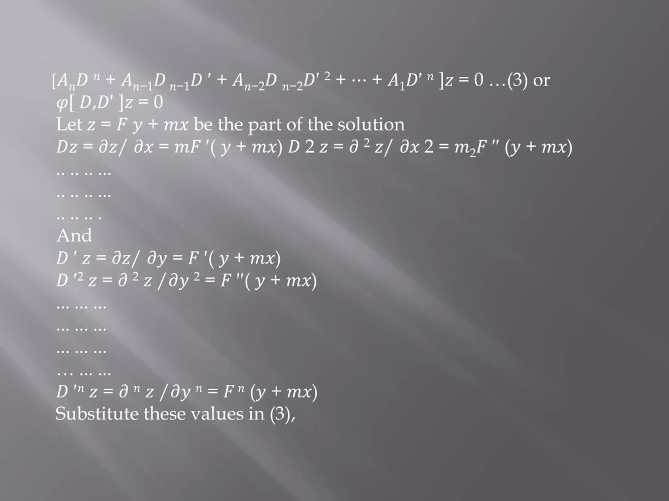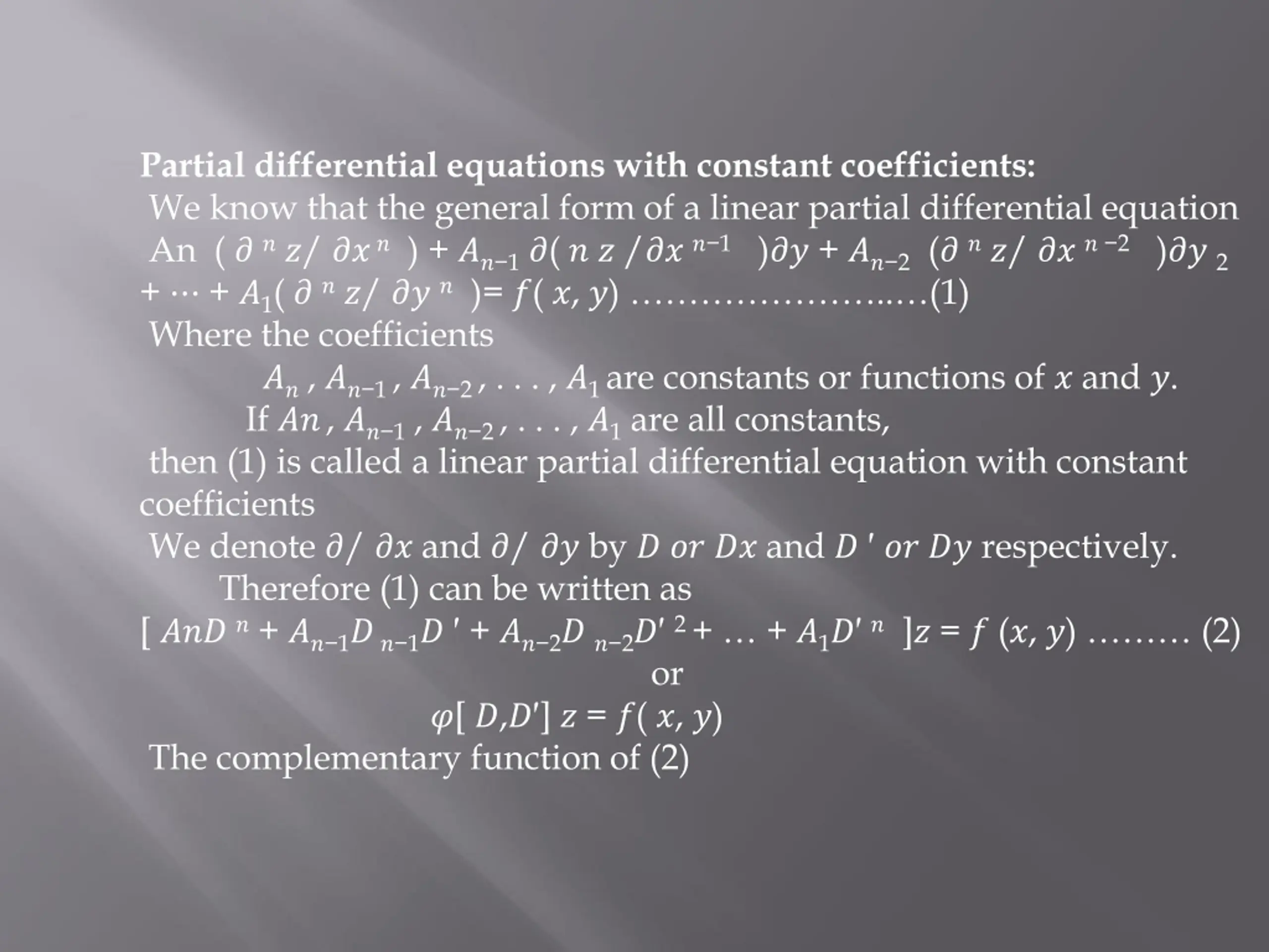 Partial differential equations with constant coefficients: We know that the general form of a linear partial differential equation An ( ???/ ??? ) + ?? 1?( ?? /??? 1 )?? + ?? 2 (???/ ??? 2 )??2 + + ?1( ???/ ??? )= ?( ?, ?) .. (1) Where the coefficients ?? , ?? 1 , ?? 2 , . . . , ?1 are constants or functions of ? and ?. If ??, ?? 1 , ?? 2 , . . . , ?1 are all constants, then (1) is called a linear partial differential equation with constant coefficients We denote ?/ ?? and ?/ ?? by ????? and ? ???? respectively. Therefore (1) can be written as [ ???? + ?? 1?? 1? + ?? 2?? 2? 2 + + ?1? ? ]? = ? (?, ?) (2) or ?[ ?,? ] ? = ?( ?, ?) The complementary function of (2)