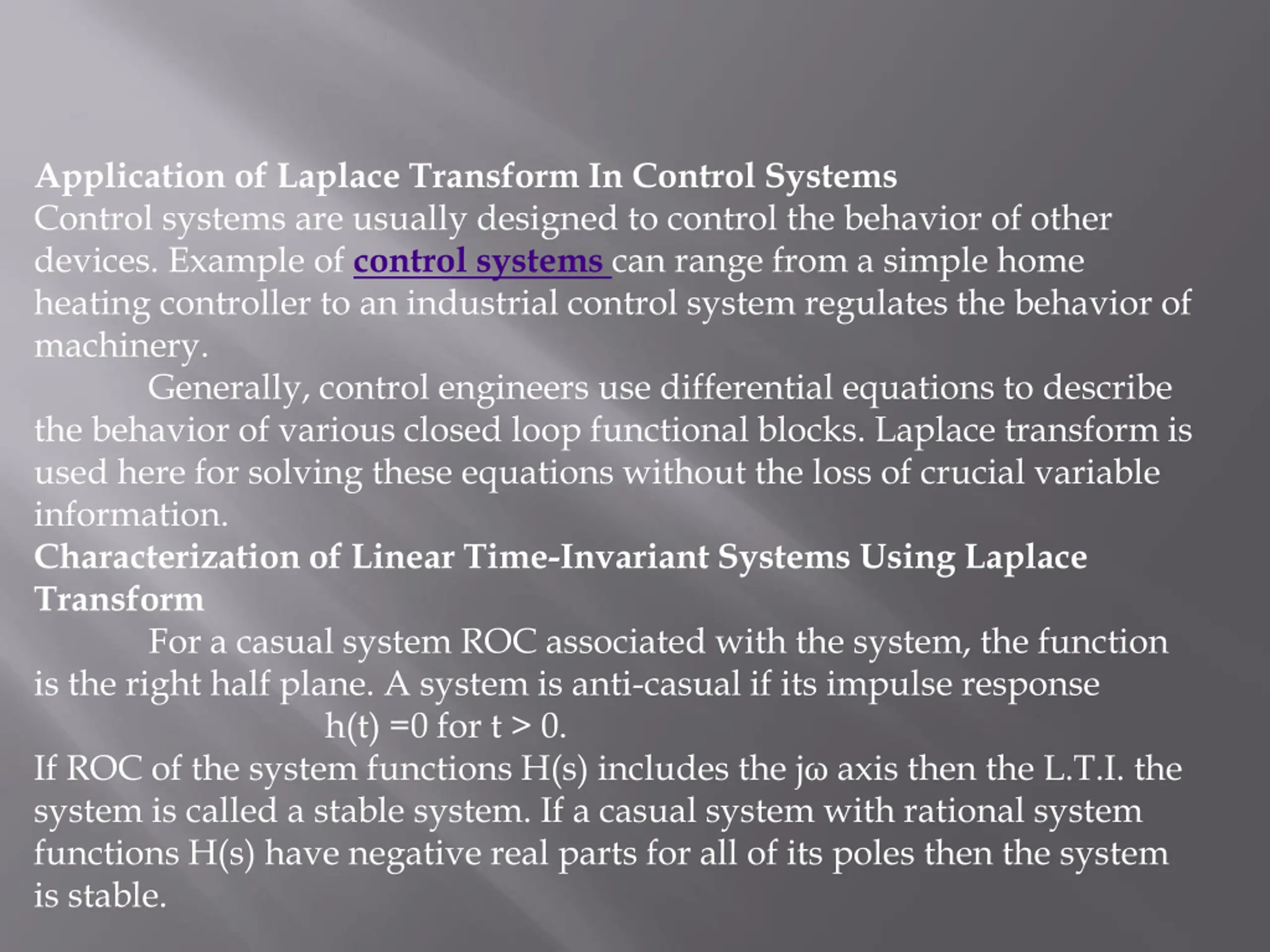 Application of Laplace Transform In Control Systems Control systems are usually designed to control the behavior of other devices. Example of control systems can range from a simple home heating controller to an industrial control system regulates the behavior of machinery. Generally, control engineers use differential equations to describe the behavior of various closed loop functional blocks. Laplace transform is used here for solving these equations without the loss of crucial variable information. Characterization of Linear Time-Invariant Systems Using Laplace Transform For a casual system ROC associated with the system, the function is the right half plane. A system is anti-casual if its impulse response h(t) =0 for t > 0. If ROC of the system functions H(s) includes the j axis then the L.T.I. the system is called a stable system. If a casual system with rational system functions H(s) have negative real parts for all of its poles then the system is stable.
