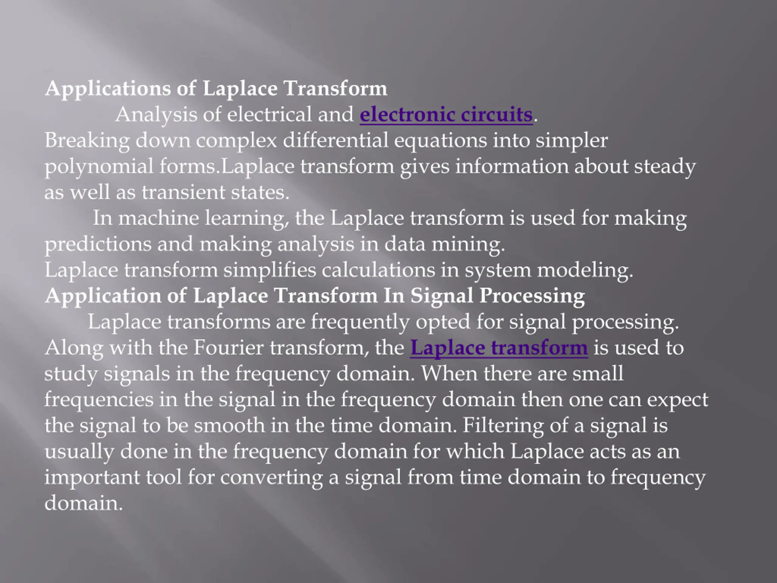 Applications of Laplace Transform Analysis of electrical and electronic circuits. Breaking down complex differential equations into simpler polynomial forms.Laplace transform gives information about steady as well as transient states. In machine learning, the Laplace transform is used for making predictions and making analysis in data mining. Laplace transform simplifies calculations in system modeling. Application of Laplace Transform In Signal Processing Laplace transforms are frequently opted for signal processing. Along with the Fourier transform, the Laplace transform is used to study signals in the frequency domain. When there are small frequencies in the signal in the frequency domain then one can expect the signal to be smooth in the time domain. Filtering of a signal is usually done in the frequency domain for which Laplace acts as an important tool for converting a signal from time domain to frequency domain.
