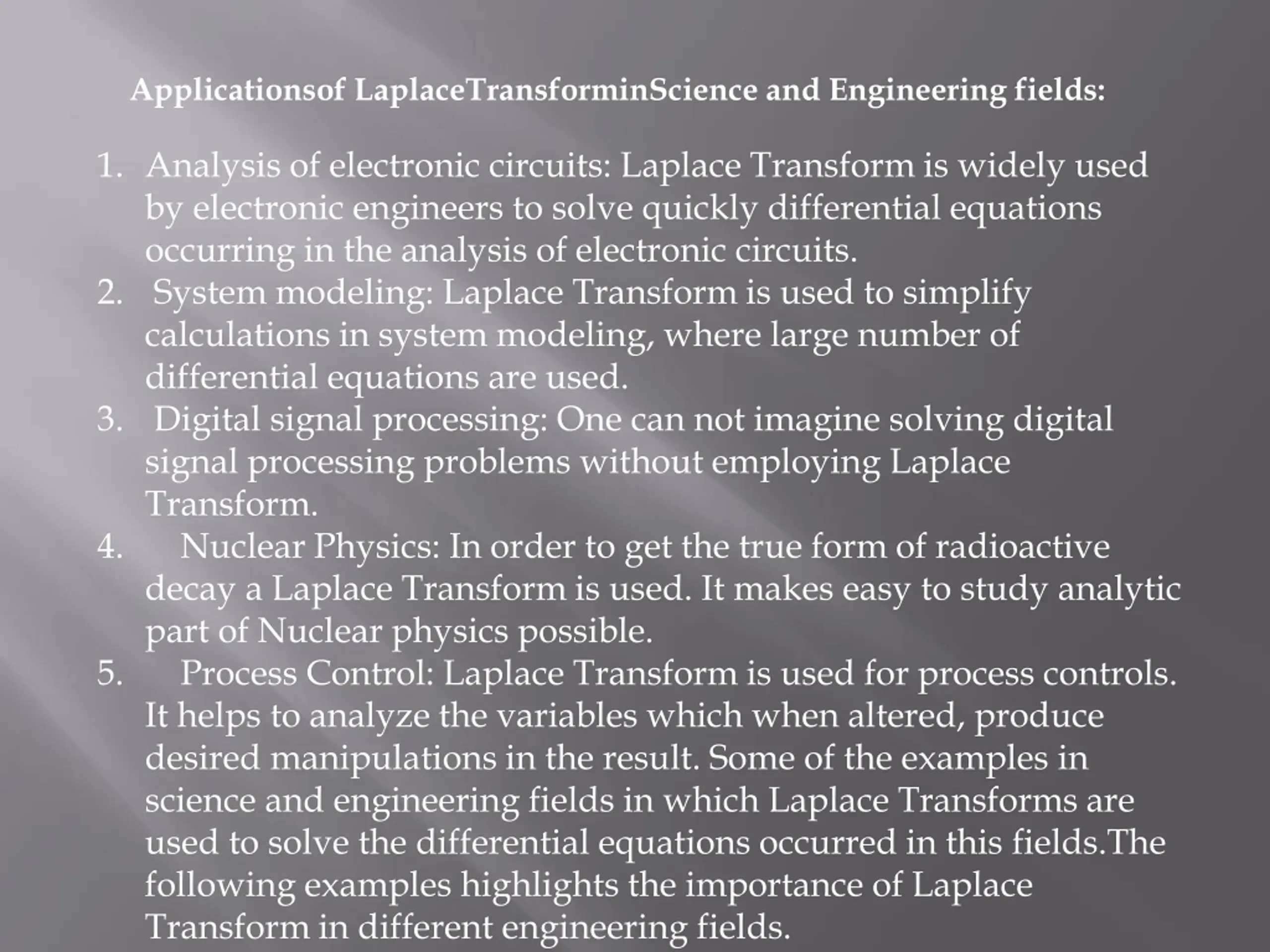 Applicationsof LaplaceTransforminScience and Engineering fields: 1. Analysis of electronic circuits: Laplace Transform is widely used by electronic engineers to solve quickly differential equations occurring in the analysis of electronic circuits. 2. System modeling: Laplace Transform is used to simplify calculations in system modeling, where large number of differential equations are used. 3. Digital signal processing: One can not imagine solving digital signal processing problems without employing Laplace Transform. 4. Nuclear Physics: In order to get the true form of radioactive decay a Laplace Transform is used. It makes easy to study analytic part of Nuclear physics possible. 5. Process Control: Laplace Transform is used for process controls. It helps to analyze the variables which when altered, produce desired manipulations in the result. Some of the examples in science and engineering fields in which Laplace Transforms are used to solve the differential equations occurred in this fields.The following examples highlights the importance of Laplace Transform in different engineering fields.