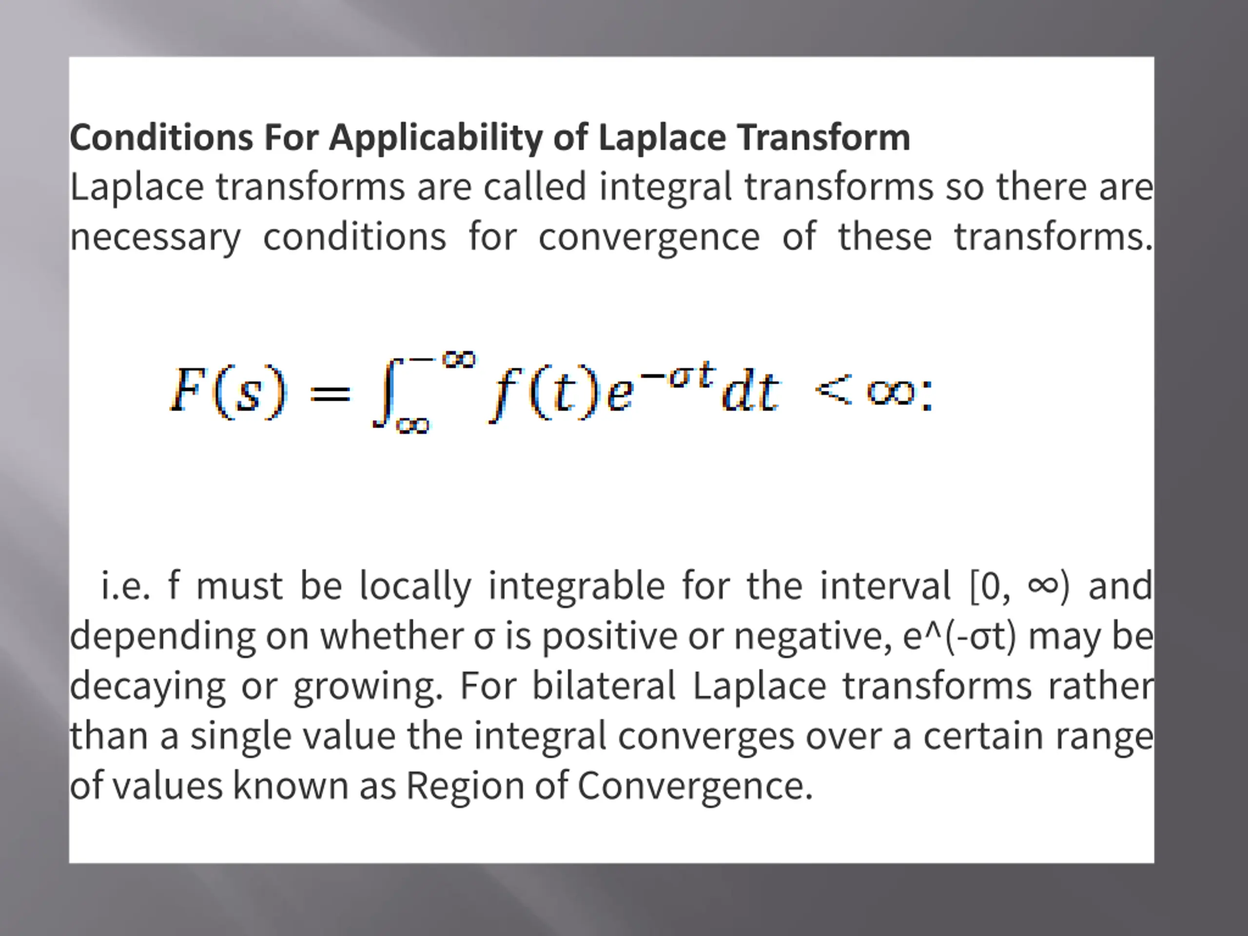 Conditions For Applicability of Laplace Transform Laplace transforms are called integral transforms so there are necessary conditions for convergence of these transforms. i.e. f must be locally integrable for the interval [0, ) and depending on whether is positive or negative, e^(- t) may be decaying or growing. For bilateral Laplace transforms rather than a single value the integral converges over a certain range of values known as Region of Convergence.