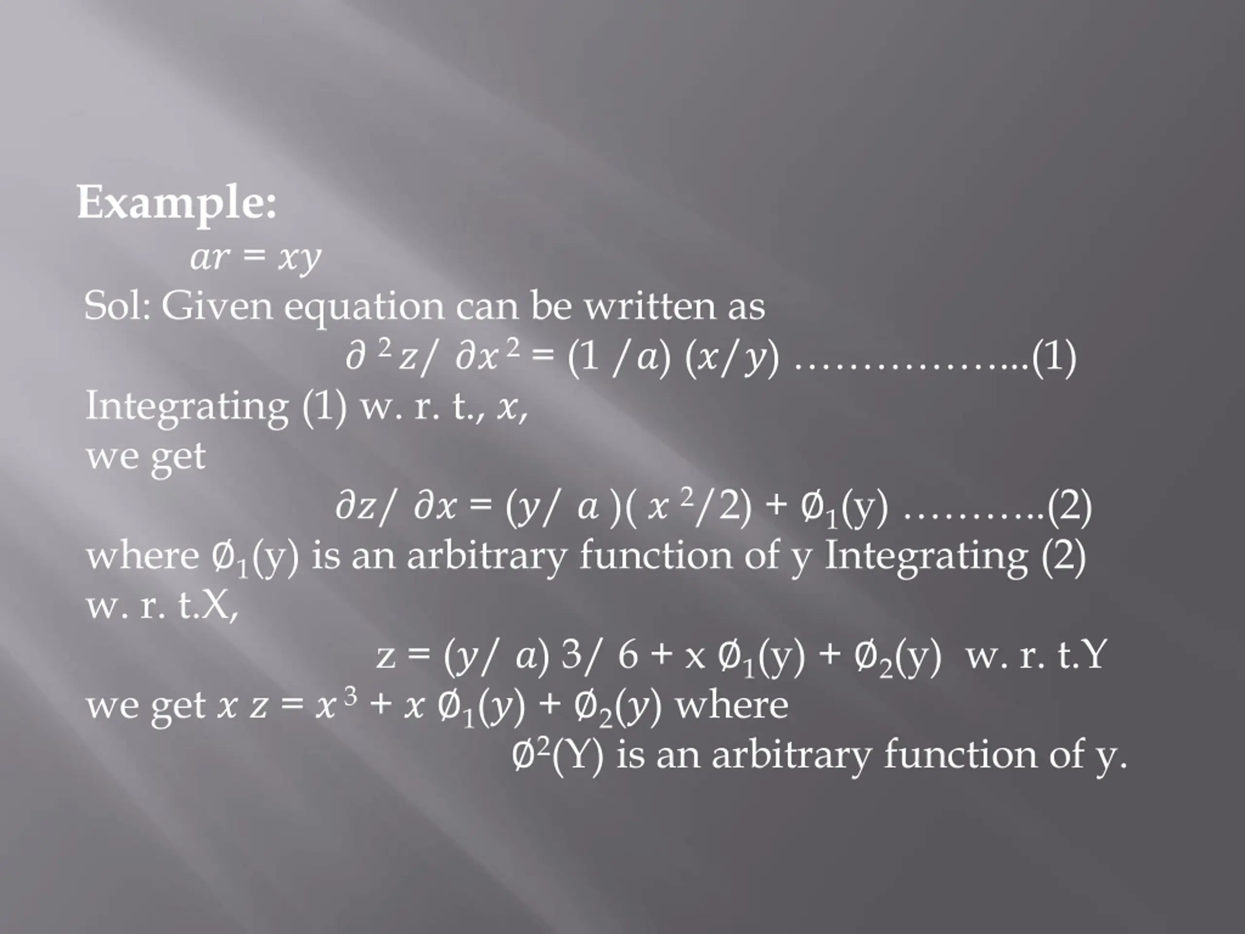 Example: ?? = ?? Sol: Given equation can be written as ?2 ?/ ?? 2 = (1 /?) (?/?) ...(1) Integrating (1) w. r. t., ?, we get ??/ ?? = (?/ ? )( ?2/2) + 1(y) ..(2) where 1(y) is an arbitrary function of y Integrating (2) w. r. t.X, z = (?/ ?) 3/ 6 + x 1(y) + 2(y) w. r. t.Y we get ?? = ? 3 + ? 1(?) + 2(?) where 2(Y) is an arbitrary function of y.