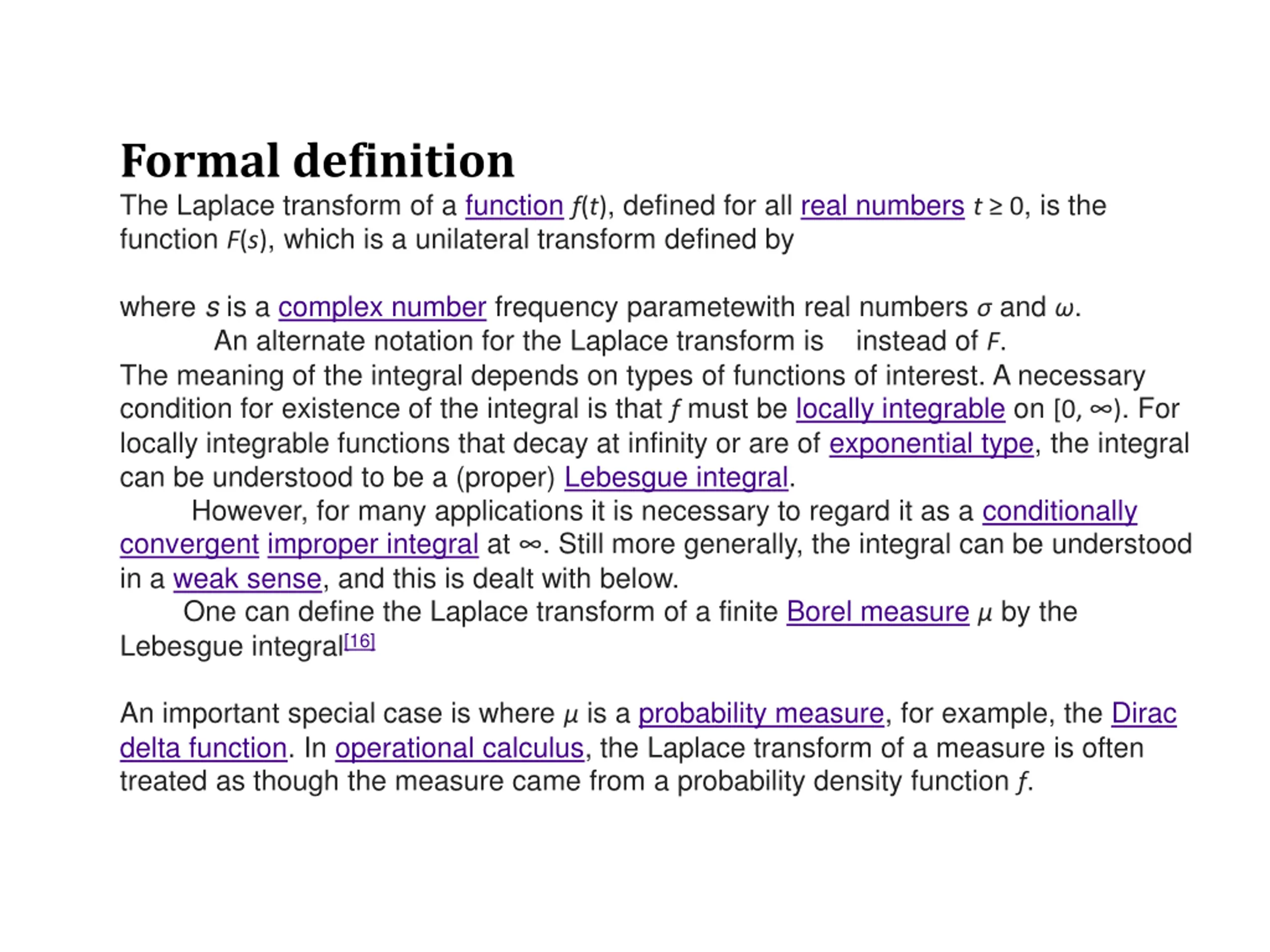 Formal definition The Laplace transform of a function f(t), defined for all real numbers t 0, is the function F(s), which is a unilateral transform defined by where s is a complex number frequency parametewith real numbers and . An alternate notation for the Laplace transform is instead of F. The meaning of the integral depends on types of functions of interest. A necessary condition for existence of the integral is that f must be locally integrable on [0, ). For locally integrable functions that decay at infinity or are of exponential type, the integral can be understood to be a (proper) Lebesgue integral. However, for many applications it is necessary to regard it as a conditionally convergent improper integral at . Still more generally, the integral can be understood in a weak sense, and this is dealt with below. One can define the Laplace transform of a finite Borel measure by the Lebesgue integral[16] An important special case is where is a probability measure, for example, the Dirac delta function. In operational calculus, the Laplace transform of a measure is often treated as though the measure came from a probability density function f. ( E q . 1 )