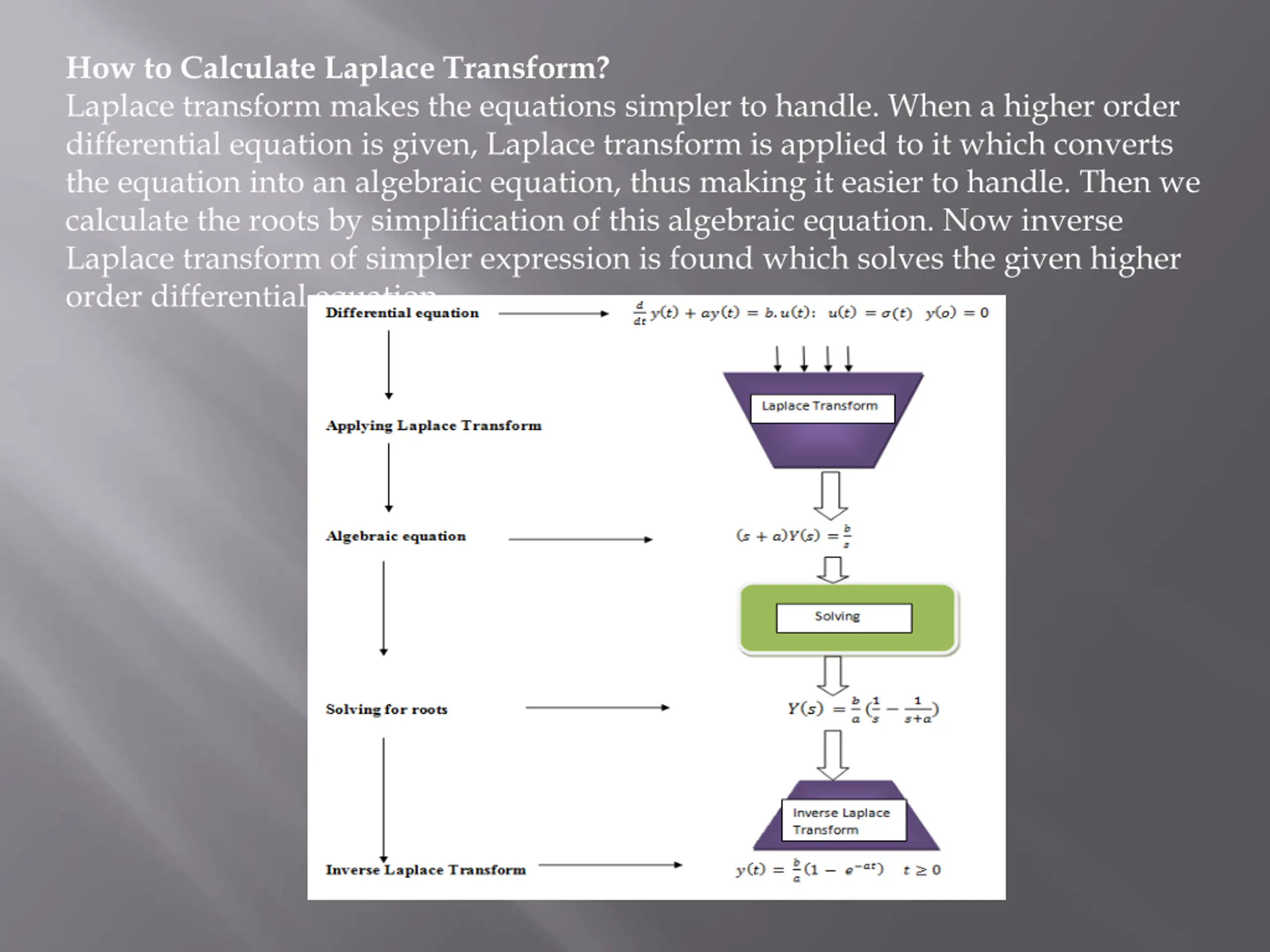 How to Calculate Laplace Transform? Laplace transform makes the equations simpler to handle. When a higher order differential equation is given, Laplace transform is applied to it which converts the equation into an algebraic equation, thus making it easier to handle. Then we calculate the roots by simplification of this algebraic equation. Now inverse Laplace transform of simpler expression is found which solves the given higher order differential equation.