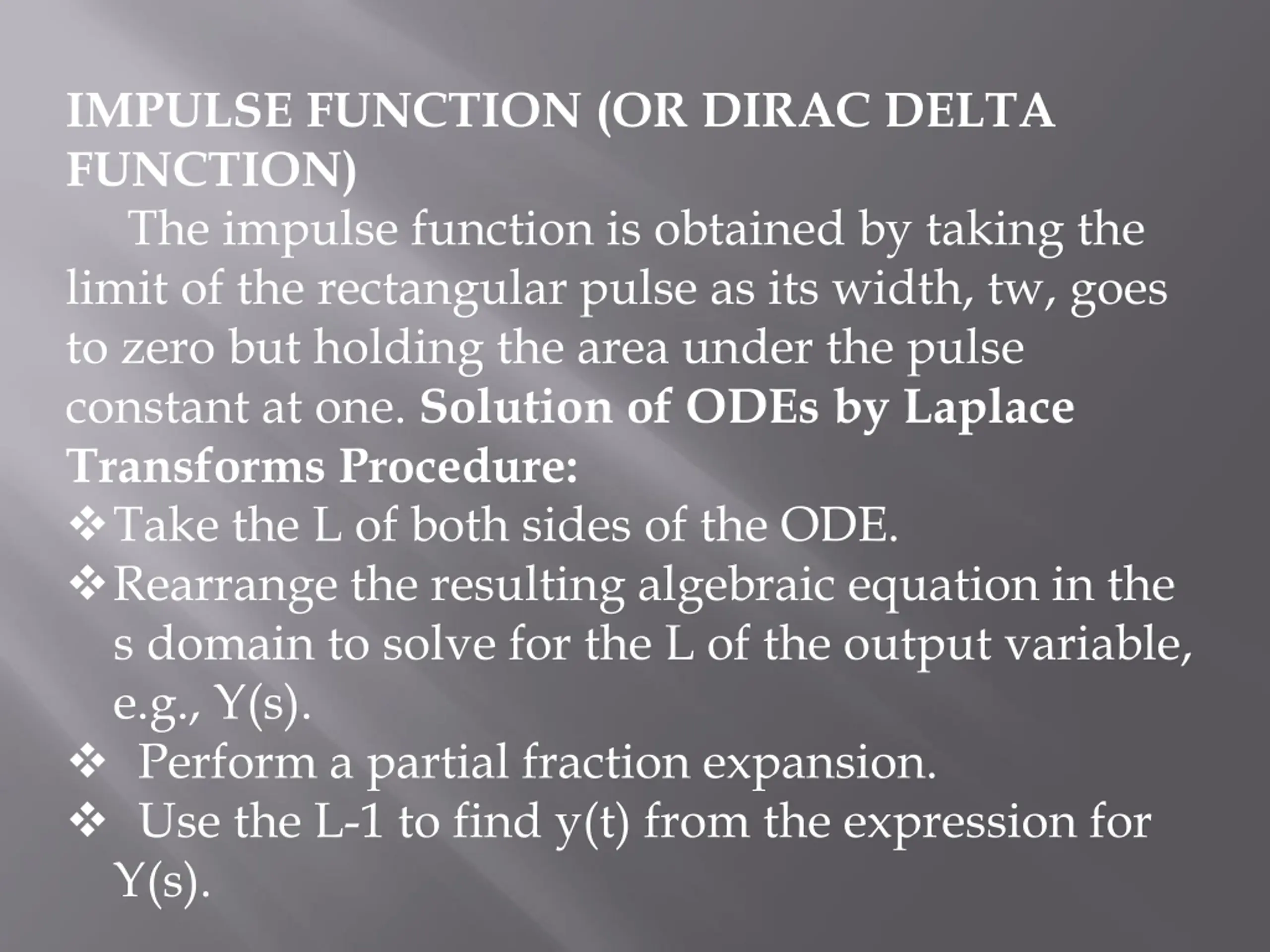 IMPULSE FUNCTION (OR DIRAC DELTA FUNCTION) The impulse function is obtained by taking the limit of the rectangular pulse as its width, tw, goes to zero but holding the area under the pulse constant at one. Solution of ODEs by Laplace Transforms Procedure: Take the L of both sides of the ODE. Rearrange the resulting algebraic equation in the s domain to solve for the L of the output variable, e.g., Y(s). Perform a partial fraction expansion. Use the L-1 to find y(t) from the expression for Y(s).