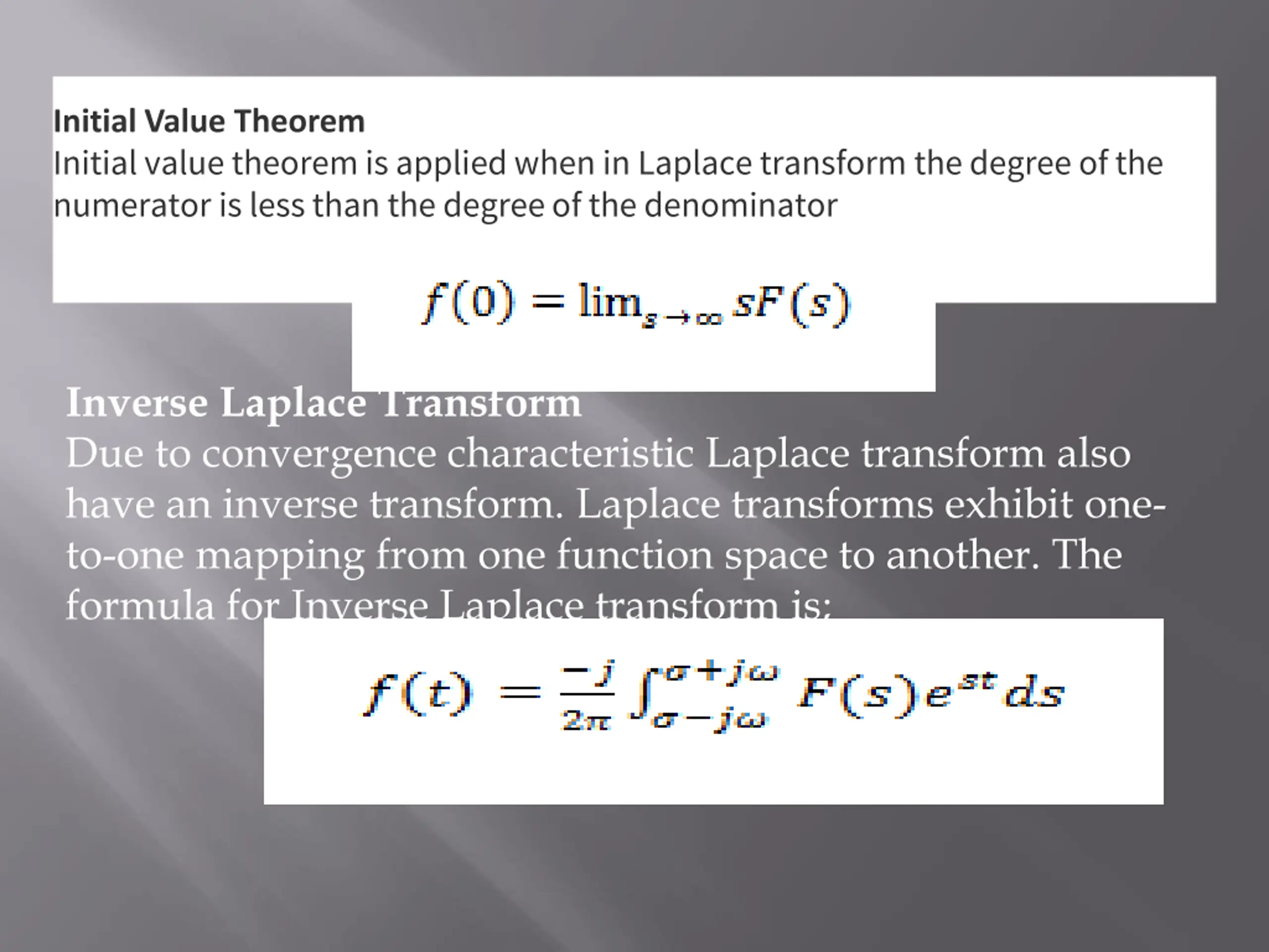 Initial Value Theorem Initial value theorem is applied when in Laplace transform the degree of the numerator is less than the degree of the denominator Inverse Laplace Transform Due to convergence characteristic Laplace transform also have an inverse transform. Laplace transforms exhibit one- to-one mapping from one function space to another. The formula for Inverse Laplace transform is;