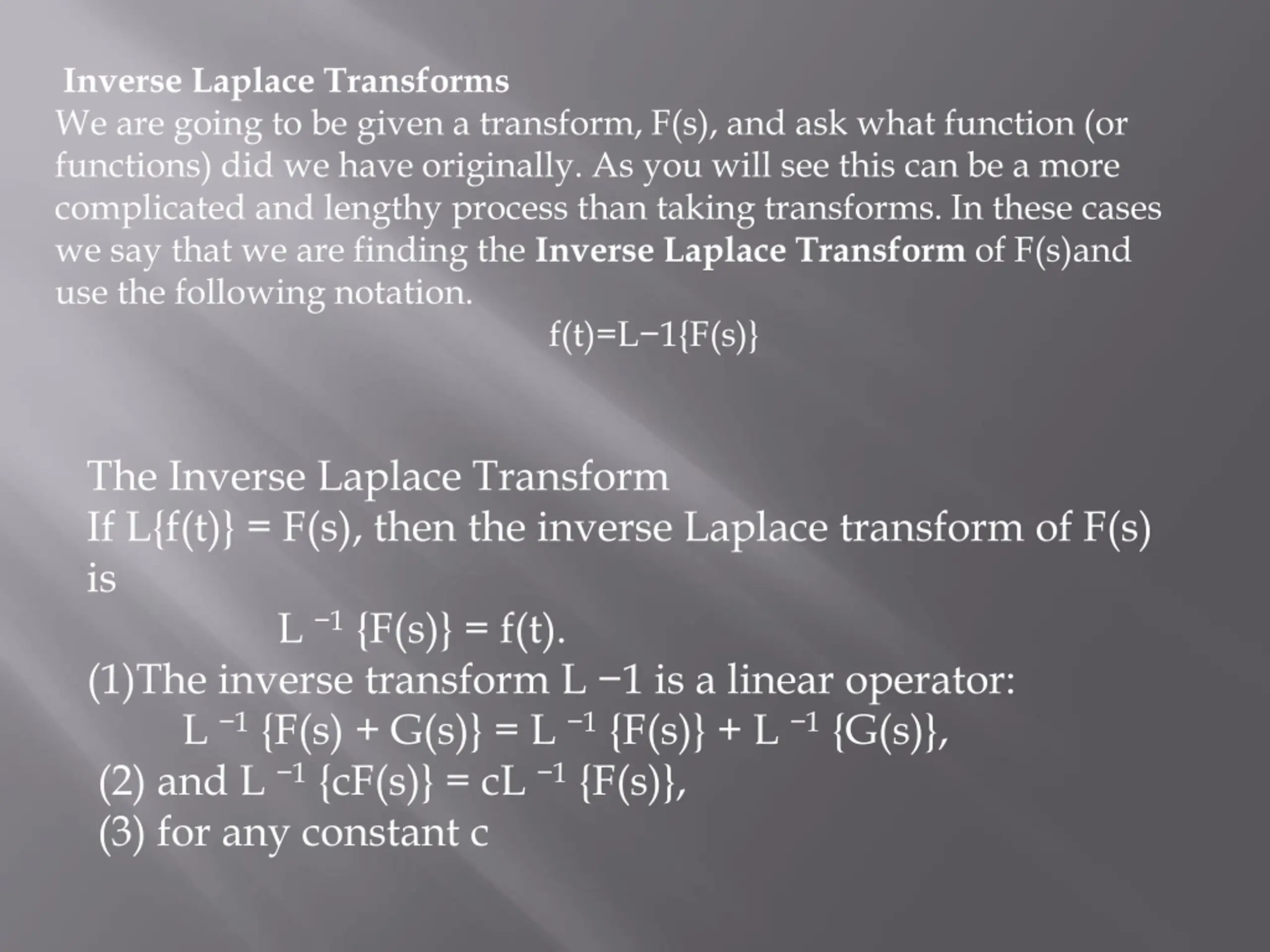 Inverse Laplace Transforms We are going to be given a transform, F(s), and ask what function (or functions) did we have originally. As you will see this can be a more complicated and lengthy process than taking transforms. In these cases we say that we are finding the Inverse Laplace Transform of F(s)and use the following notation. f(t)=L 1{F(s)} The Inverse Laplace Transform If L{f(t)} = F(s), then the inverse Laplace transform of F(s) is L 1 {F(s)} = f(t). (1)The inverse transform L 1 is a linear operator: L 1 {F(s) + G(s)} = L 1 {F(s)} + L 1 {G(s)}, (2) and L 1 {cF(s)} = cL 1 {F(s)}, (3) for any constant c