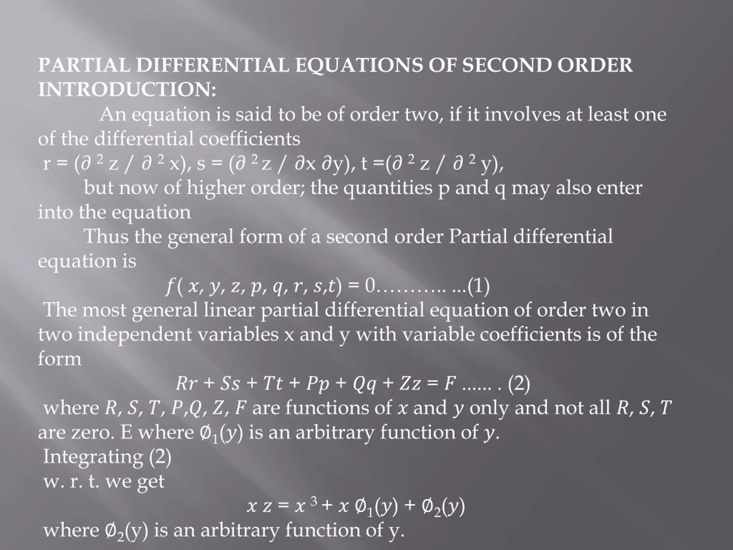 PARTIAL DIFFERENTIAL EQUATIONS OF SECOND ORDER INTRODUCTION: An equation is said to be of order two, if it involves at least one of the differential coefficients r = (?2 z / ?2 x), s = (?2 z / ?x ?y), t =(?2 z / ?2 y), but now of higher order; the quantities p and q may also enter into the equation Thus the general form of a second order Partial differential equation is ?( ?, ?, ?, ?, ?, ?, ?,?) = 0 .. ...(1) The most general linear partial differential equation of order two in two independent variables x and y with variable coefficients is of the form ?? + ?? + ?? + ?? + ?? + ?? = ? ...... . (2) where ?, ?, ?, ?,?, ?, ? are functions of ? and ? only and not all ?, ?, ? are zero. E where 1(?) is an arbitrary function of ?. Integrating (2) w. r. t. we get ?? = ?3 + ? 1(?) + 2(?) where 2(y) is an arbitrary function of y.