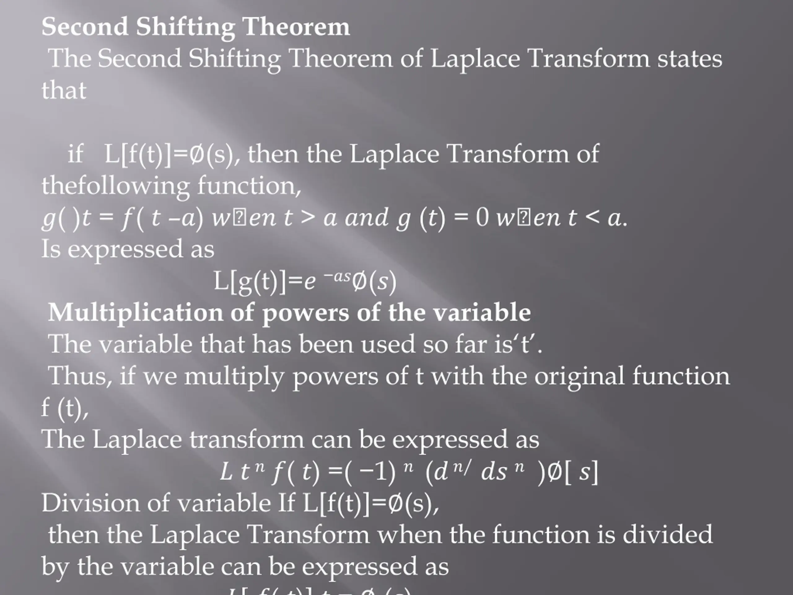 Second Shifting Theorem The Second Shifting Theorem of Laplace Transform states that if L[f(t)]= (s), then the Laplace Transform of thefollowing function, ?( )? = ?( ? ?) ????? > ????? (?) = 0 ????? < ?. Is expressed as L[g(t)]=? ?? (?) Multiplication of powers of the variable The variable that has been used so far is t . Thus, if we multiply powers of t with the original function f (t), The Laplace transform can be expressed as ????( ?) =( 1) ?(??/??? ) [ ?] Division of variable If L[f(t)]= (s), then the Laplace Transform when the function is divided by the variable can be expressed as ?[ ?( ?)] ? = (?)