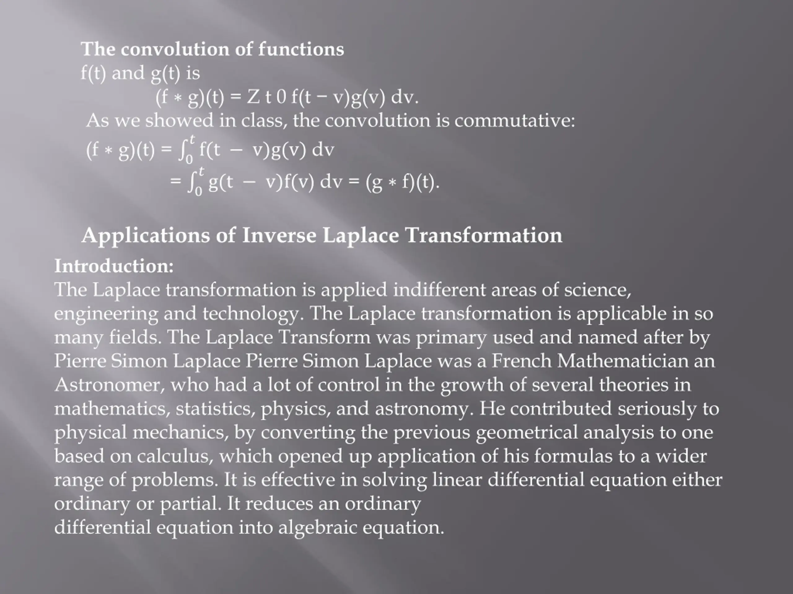 The convolution of functions f(t) and g(t) is (f g)(t) = Z t 0 f(t v)g(v) dv. As we showed in class, the convolution is commutative: (f g)(t) = 0 = 0 ?f(t v)g(v) dv ?g(t v)f(v) dv = (g f)(t). Applications of Inverse Laplace Transformation Introduction: The Laplace transformation is applied indifferent areas of science, engineering and technology. The Laplace transformation is applicable in so many fields. The Laplace Transform was primary used and named after by Pierre Simon Laplace Pierre Simon Laplace was a French Mathematician an Astronomer, who had a lot of control in the growth of several theories in mathematics, statistics, physics, and astronomy. He contributed seriously to physical mechanics, by converting the previous geometrical analysis to one based on calculus, which opened up application of his formulas to a wider range of problems. It is effective in solving linear differential equation either ordinary or partial. It reduces an ordinary differential equation into algebraic equation.