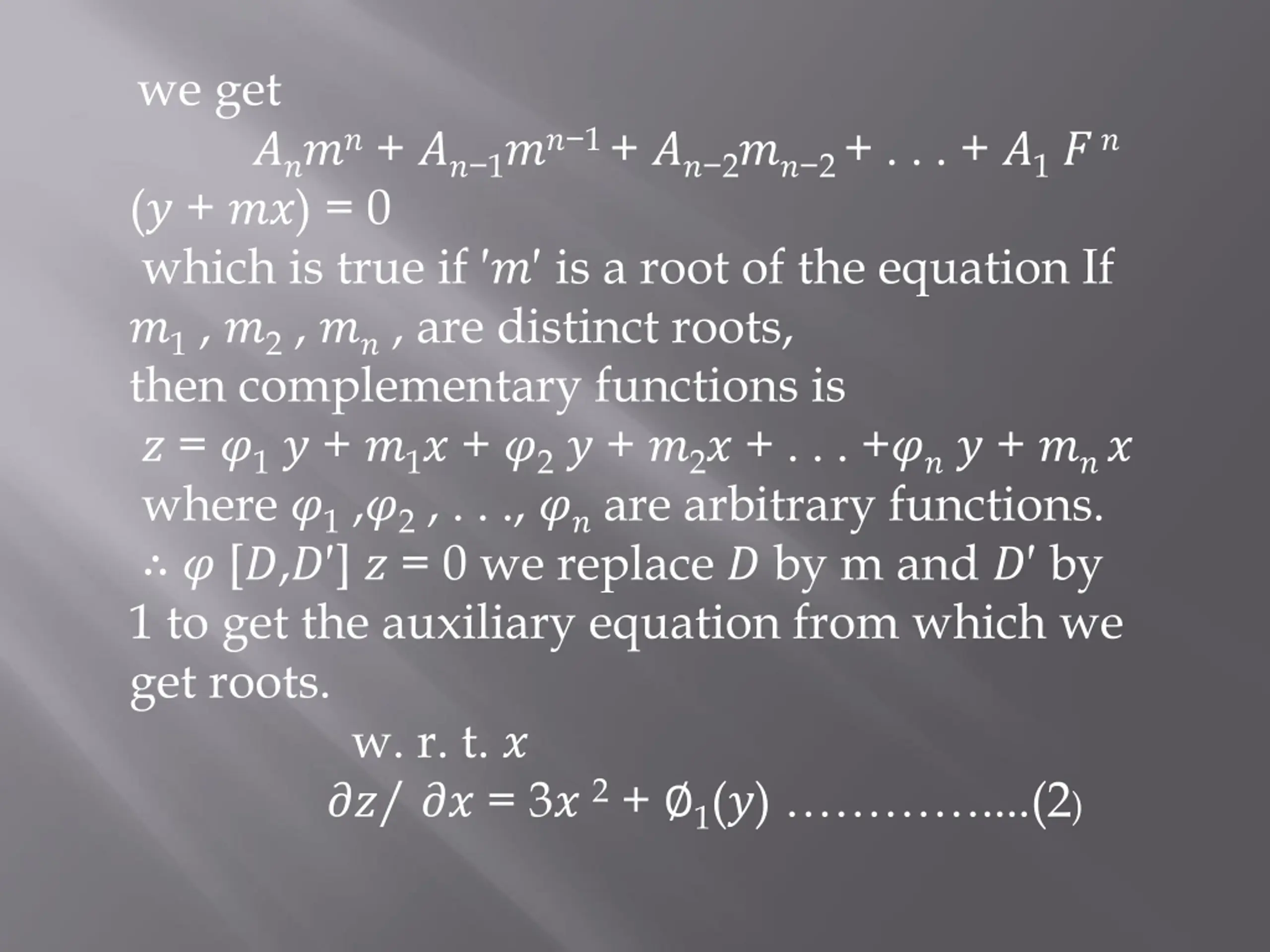 we get ???? + ?? 1?? 1 + ?? 2?? 2 + . . . + ?1?? (? + ??) = 0 which is true if ? is a root of the equation If ?1 , ?2 , ?? , are distinct roots, then complementary functions is ? = ?1? + ?1? + ?2? + ?2? + . . . +??? + ??? where ?1 ,?2 , . . ., ?? are arbitrary functions. ? [?,? ] ? = 0 we replace ? by m and ? by 1 to get the auxiliary equation from which we get roots. w. r. t. ? ??/ ?? = 3?2 + 1(?) ....(2)