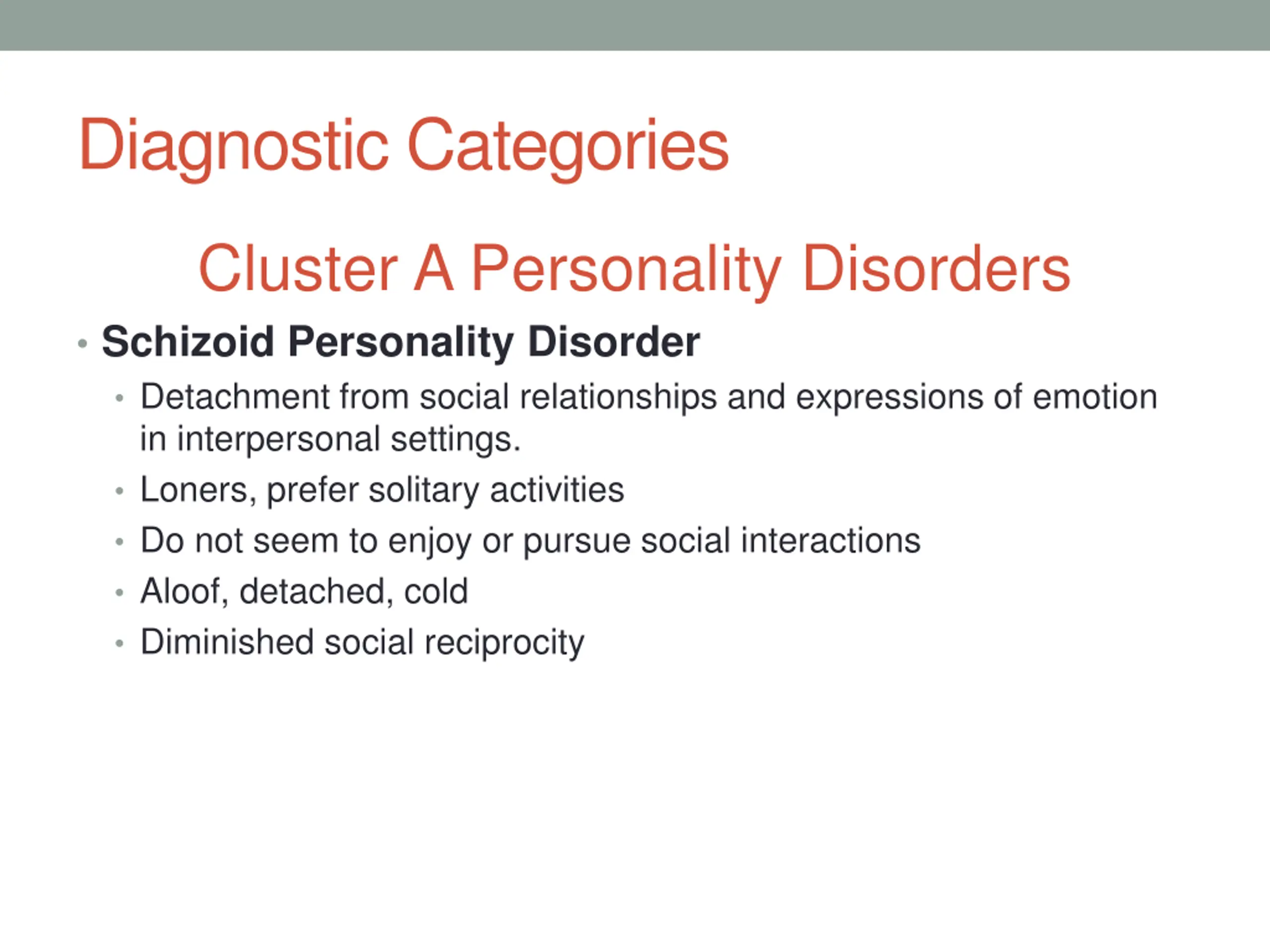 Diagnostic Categories Cluster A Personality Disorders Schizoid Personality Disorder Detachment from social relationships and expressions of emotion in interpersonal settings. Loners, prefer solitary activities Do not seem to enjoy or pursue social interactions Aloof, detached, cold Diminished social reciprocity