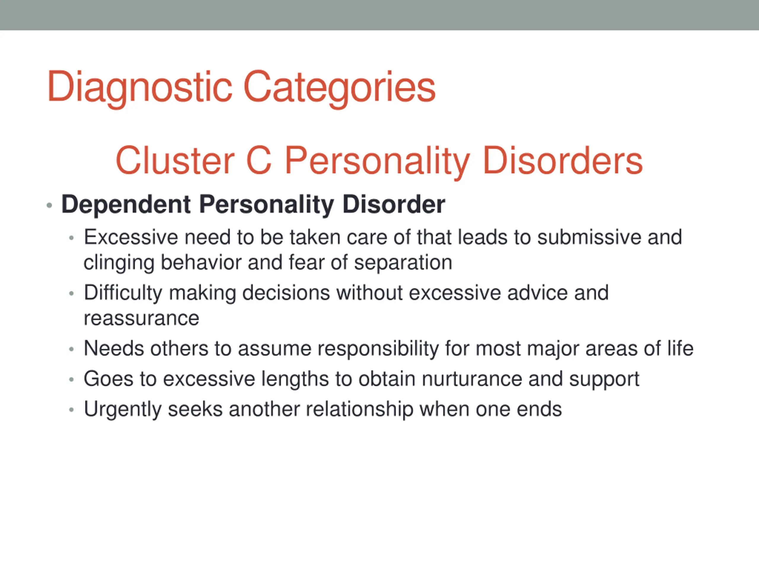 Diagnostic Categories Cluster C Personality Disorders Dependent Personality Disorder Excessive need to be taken care of that leads to submissive and clinging behavior and fear of separation Difficulty making decisions without excessive advice and reassurance Needs others to assume responsibility for most major areas of life Goes to excessive lengths to obtain nurturance and support Urgently seeks another relationship when one ends