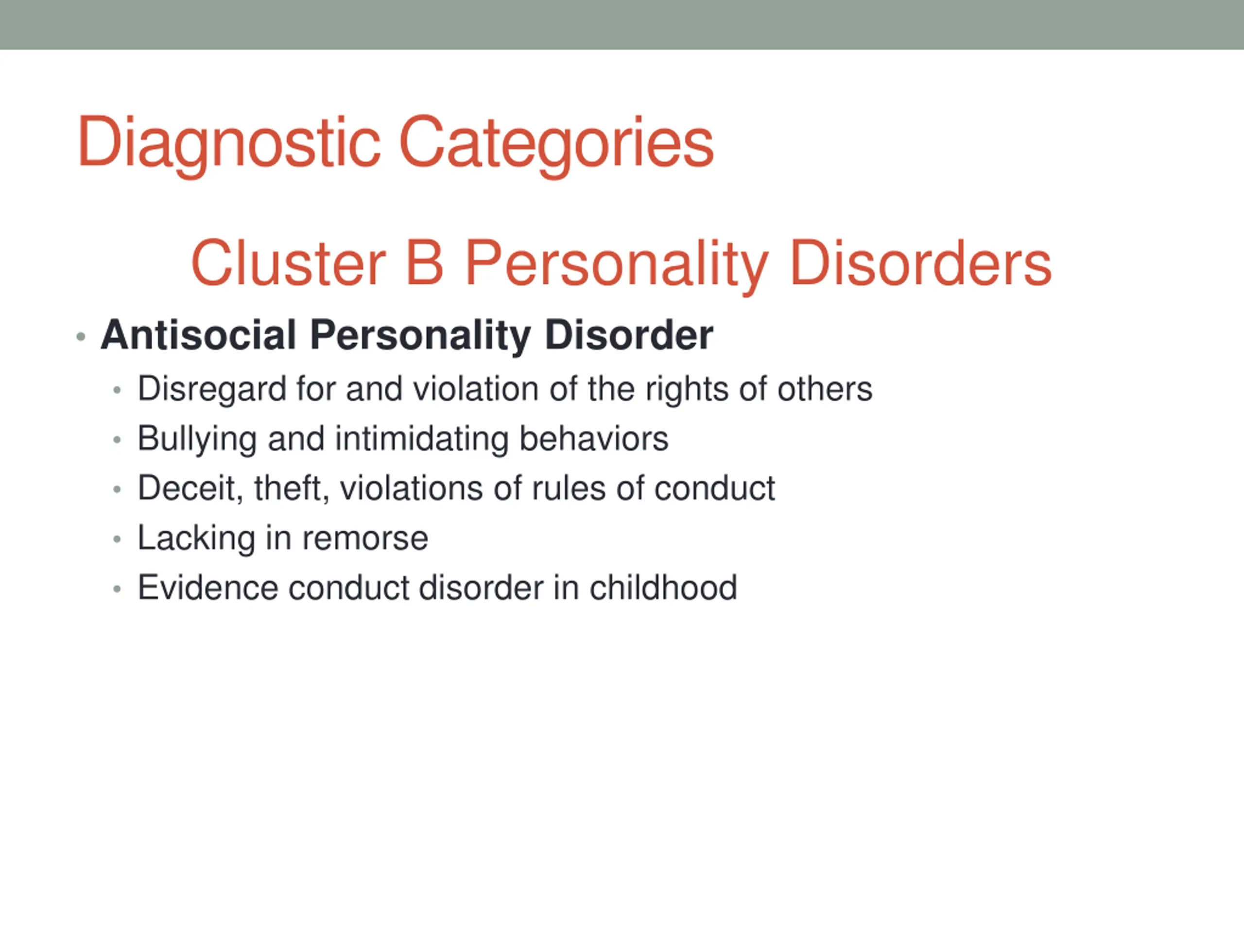 Diagnostic Categories Cluster B Personality Disorders Antisocial Personality Disorder Disregard for and violation of the rights of others Bullying and intimidating behaviors Deceit, theft, violations of rules of conduct Lacking in remorse Evidence conduct disorder in childhood