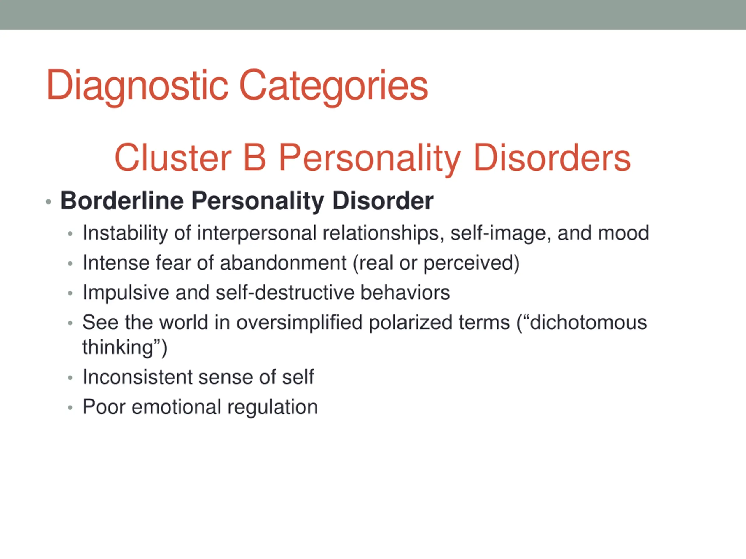 Diagnostic Categories Cluster B Personality Disorders Borderline Personality Disorder Instability of interpersonal relationships, self-image, and mood Intense fear of abandonment (real or perceived) Impulsive and self-destructive behaviors See the world in oversimplified polarized terms ( dichotomous thinking ) Inconsistent sense of self Poor emotional regulation