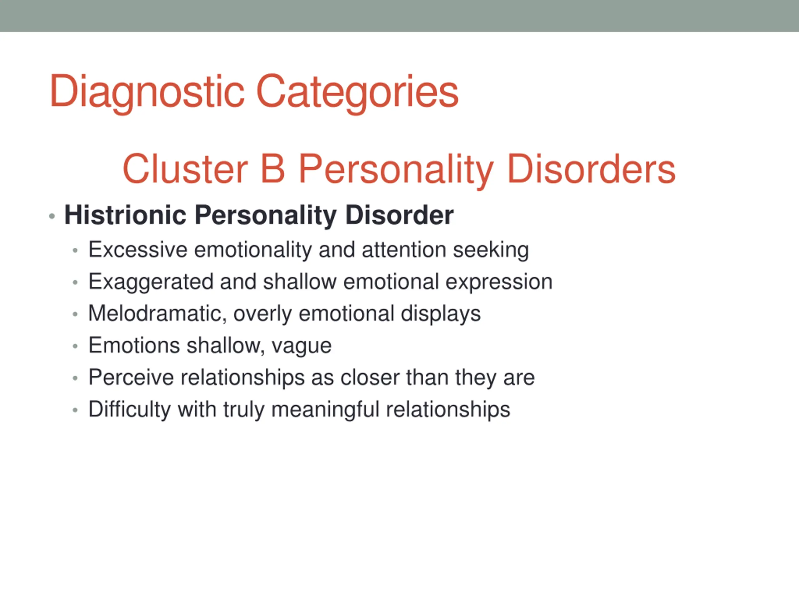 Diagnostic Categories Cluster B Personality Disorders Histrionic Personality Disorder Excessive emotionality and attention seeking Exaggerated and shallow emotional expression Melodramatic, overly emotional displays Emotions shallow, vague Perceive relationships as closer than they are Difficulty with truly meaningful relationships