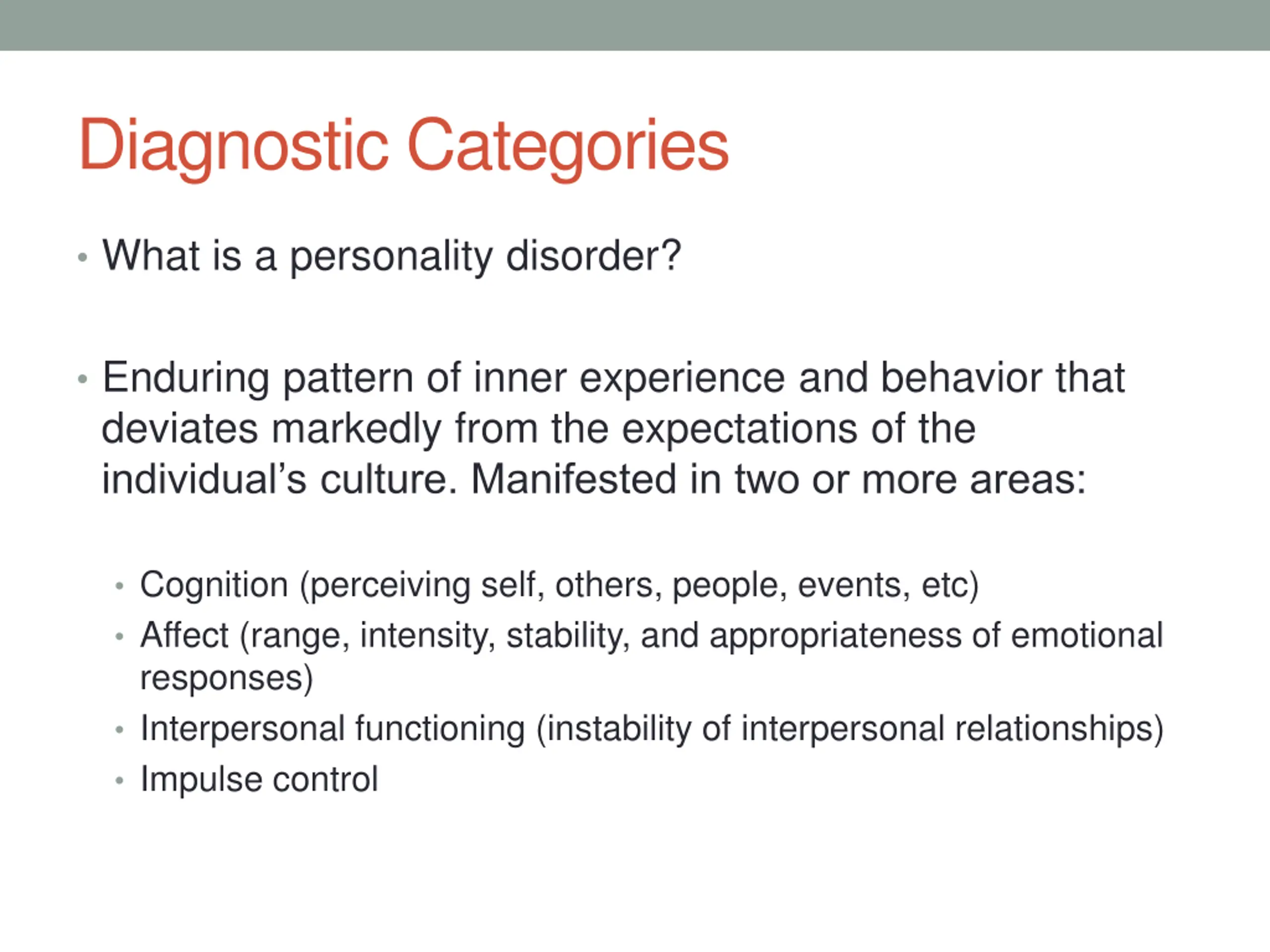 Diagnostic Categories What is a personality disorder? Enduring pattern of inner experience and behavior that deviates markedly from the expectations of the individual s culture. Manifested in two or more areas: Cognition (perceiving self, others, people, events, etc) Affect (range, intensity, stability, and appropriateness of emotional responses) Interpersonal functioning (instability of interpersonal relationships) Impulse control