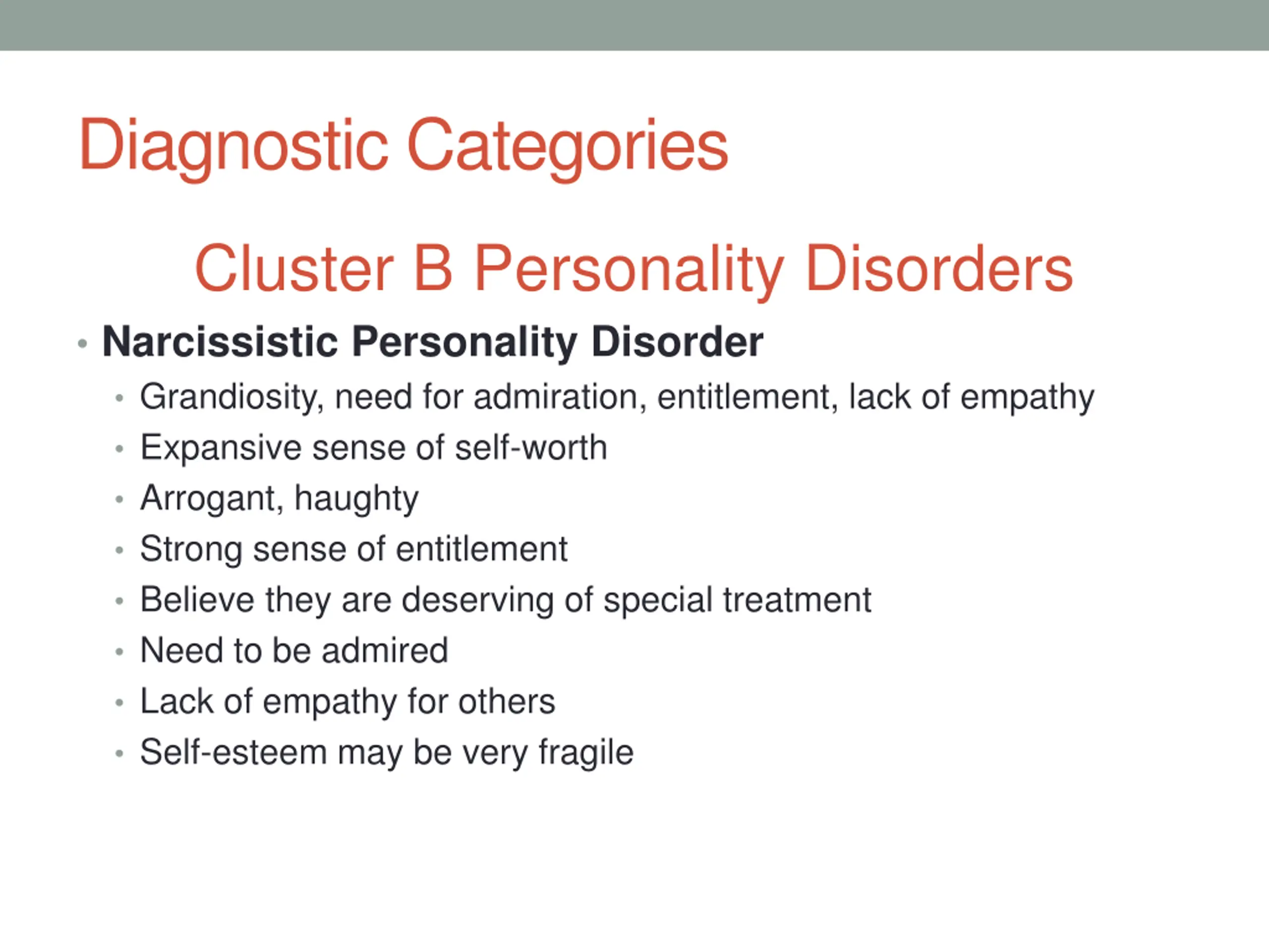 Diagnostic Categories Cluster B Personality Disorders Narcissistic Personality Disorder Grandiosity, need for admiration, entitlement, lack of empathy Expansive sense of self-worth Arrogant, haughty Strong sense of entitlement Believe they are deserving of special treatment Need to be admired Lack of empathy for others Self-esteem may be very fragile