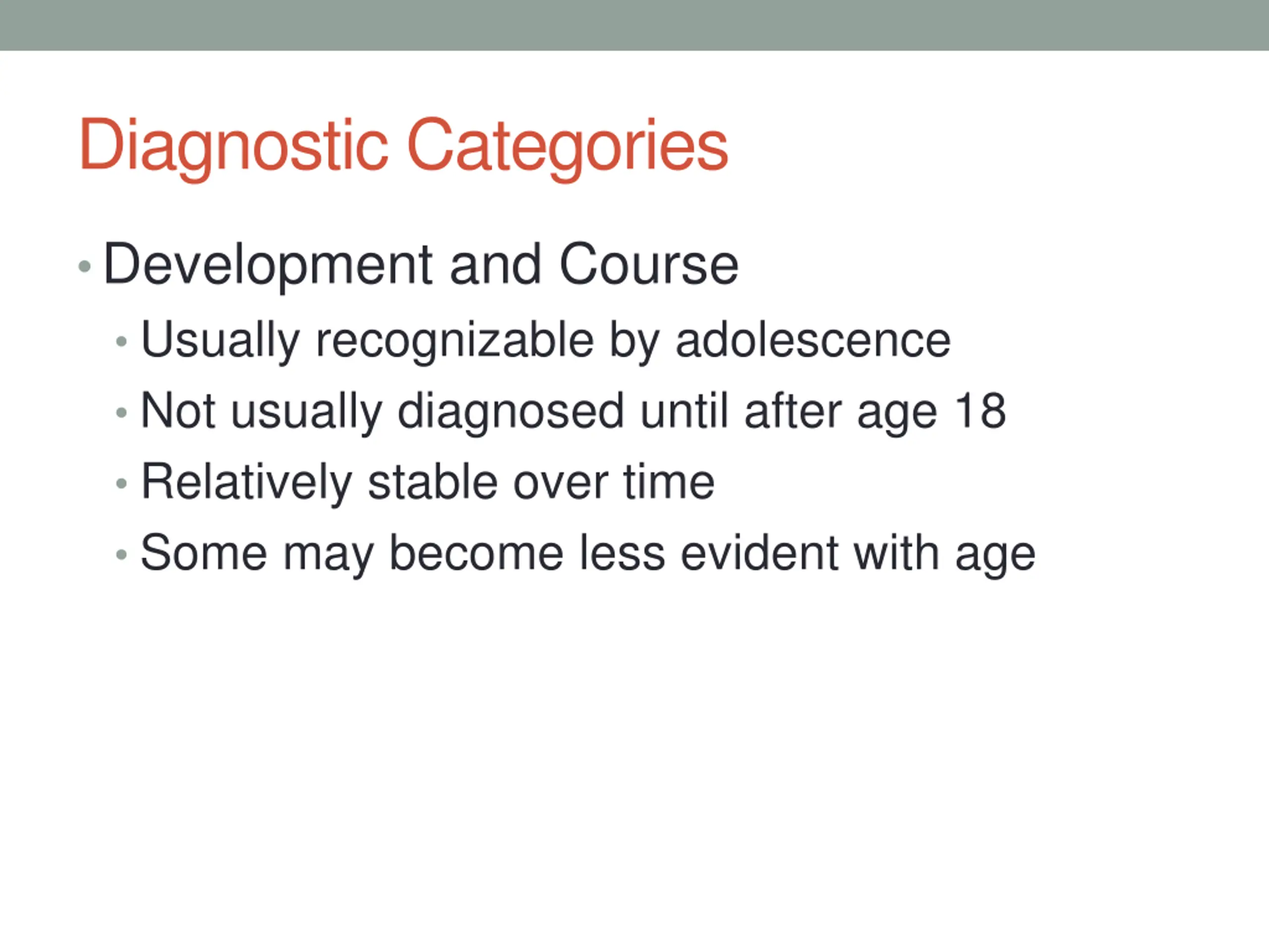 Diagnostic Categories Development and Course Usually recognizable by adolescence Not usually diagnosed until after age 18 Relatively stable over time Some may become less evident with age