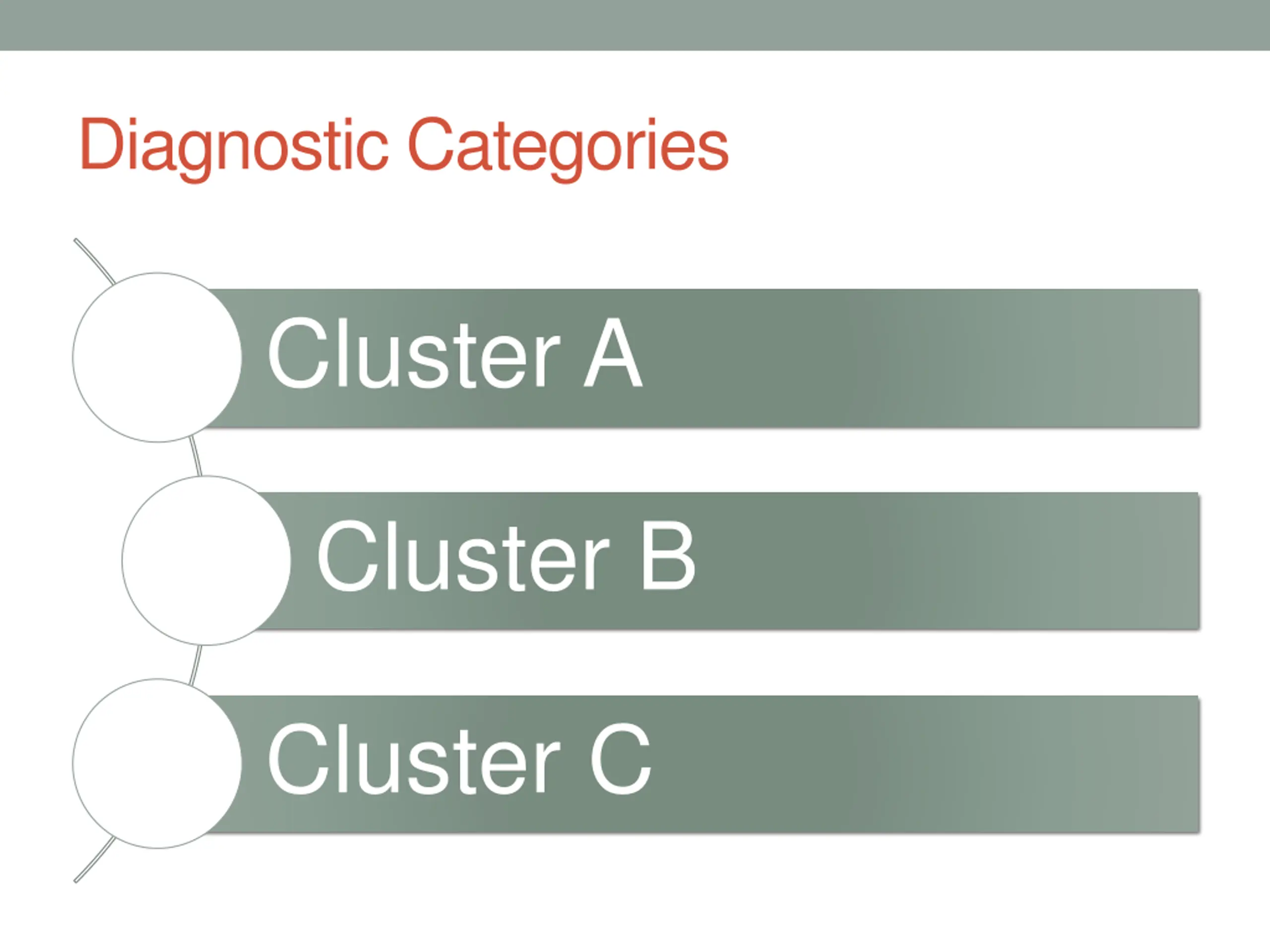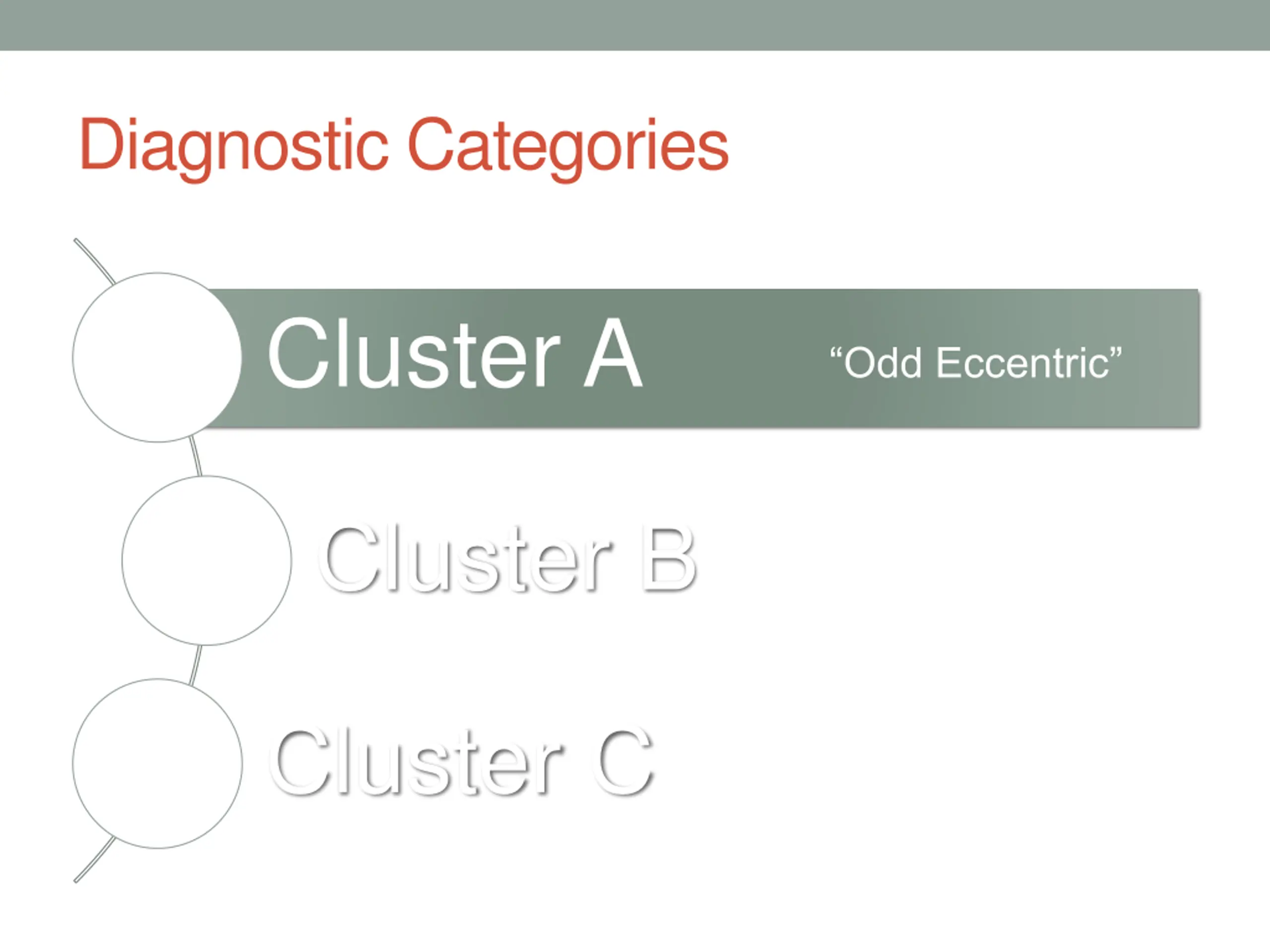 Diagnostic Categories Cluster A Odd Eccentric Cluster B Dramatic, emotional, erratic Cluster C Anxious, fearful