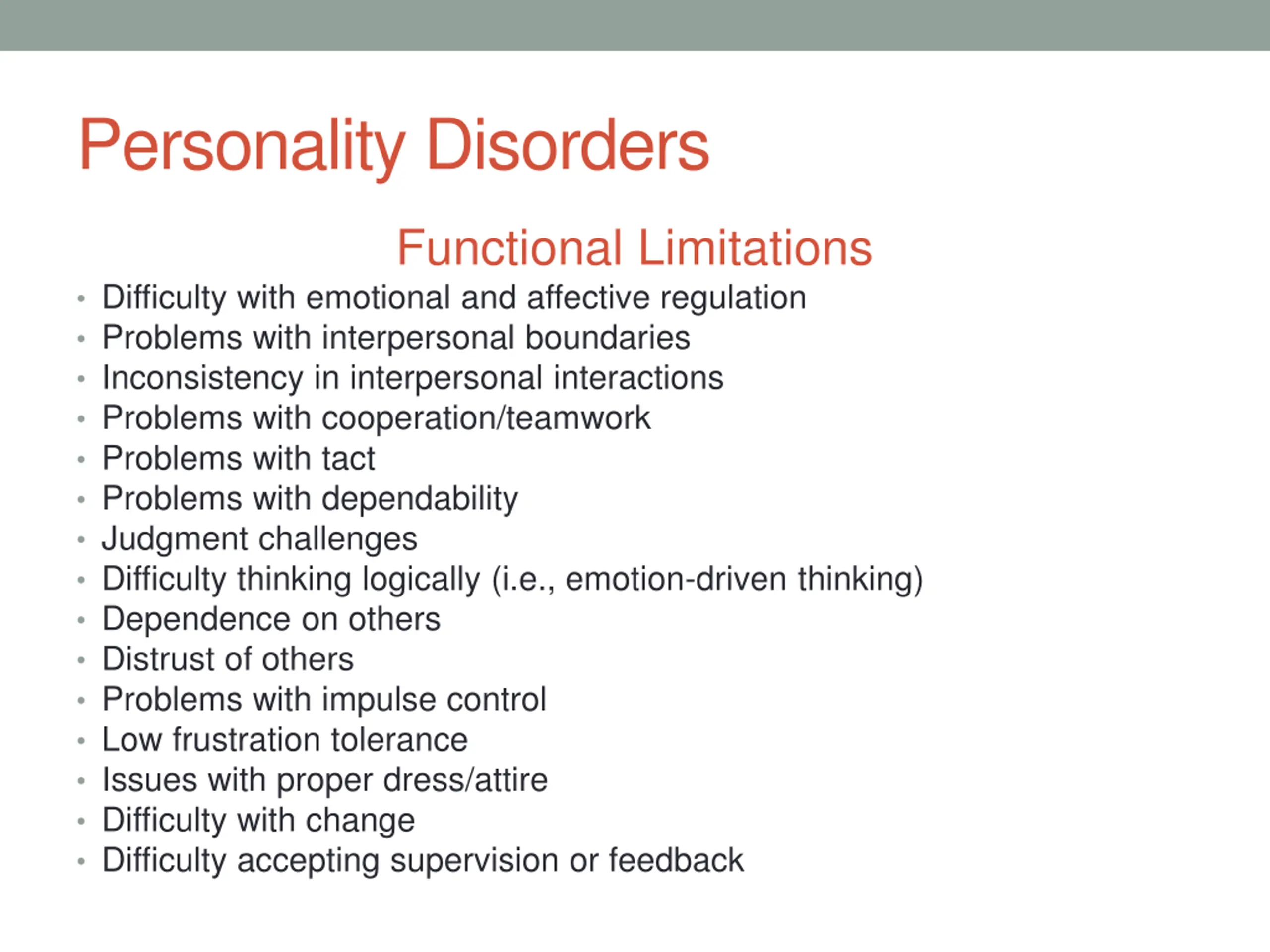 Personality Disorders Functional Limitations Difficulty with emotional and affective regulation Problems with interpersonal boundaries Inconsistency in interpersonal interactions Problems with cooperation/teamwork Problems with tact Problems with dependability Judgment challenges Difficulty thinking logically (i.e., emotion-driven thinking) Dependence on others Distrust of others Problems with impulse control Low frustration tolerance Issues with proper dress/attire Difficulty with change Difficulty accepting supervision or feedback