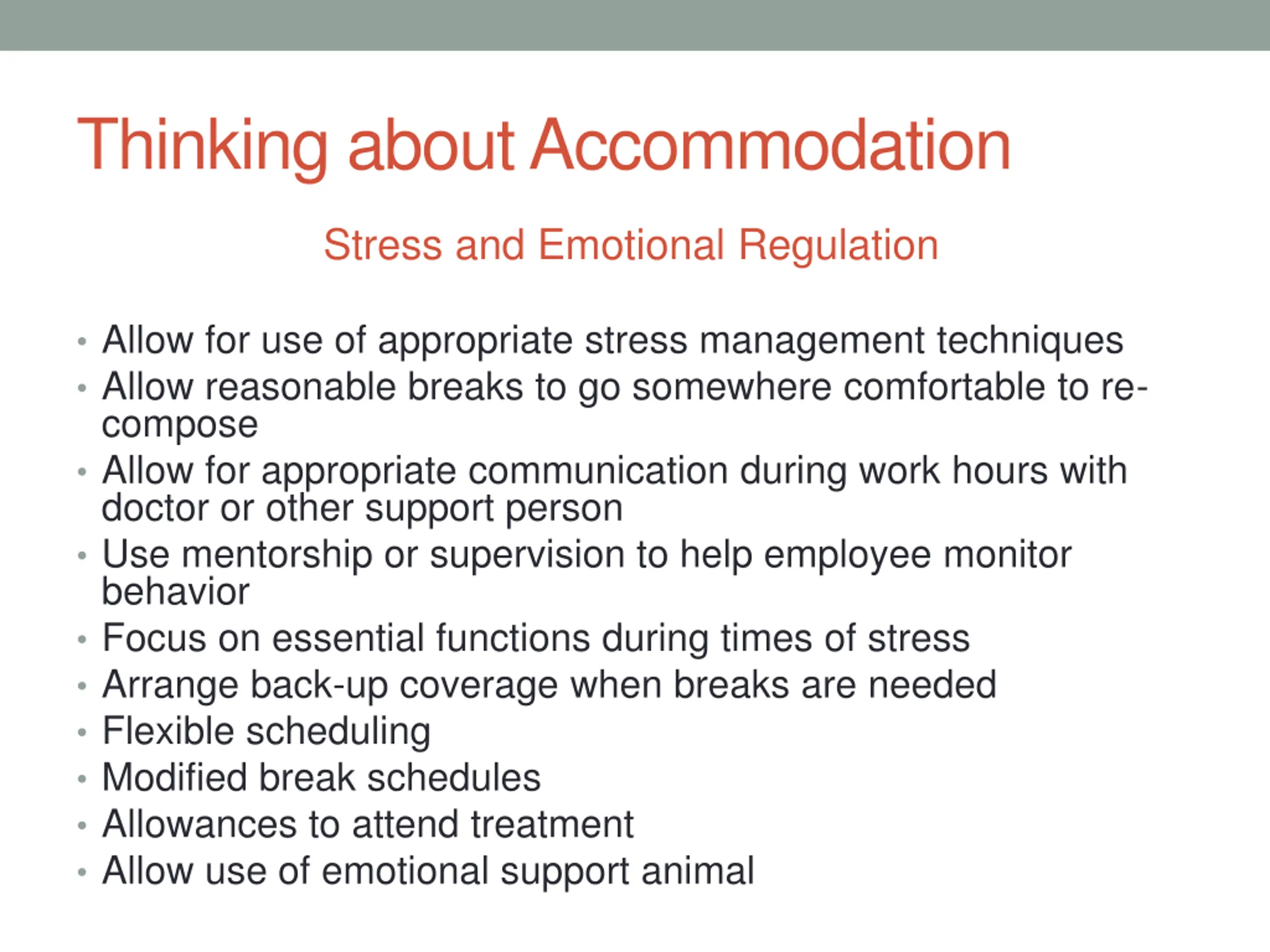 Thinking about Accommodation Stress and Emotional Regulation Allow for use of appropriate stress management techniques Allow reasonable breaks to go somewhere comfortable to re- compose Allow for appropriate communication during work hours with doctor or other support person Use mentorship or supervision to help employee monitor behavior Focus on essential functions during times of stress Arrange back-up coverage when breaks are needed Flexible scheduling Modified break schedules Allowances to attend treatment Allow use of emotional support animal
