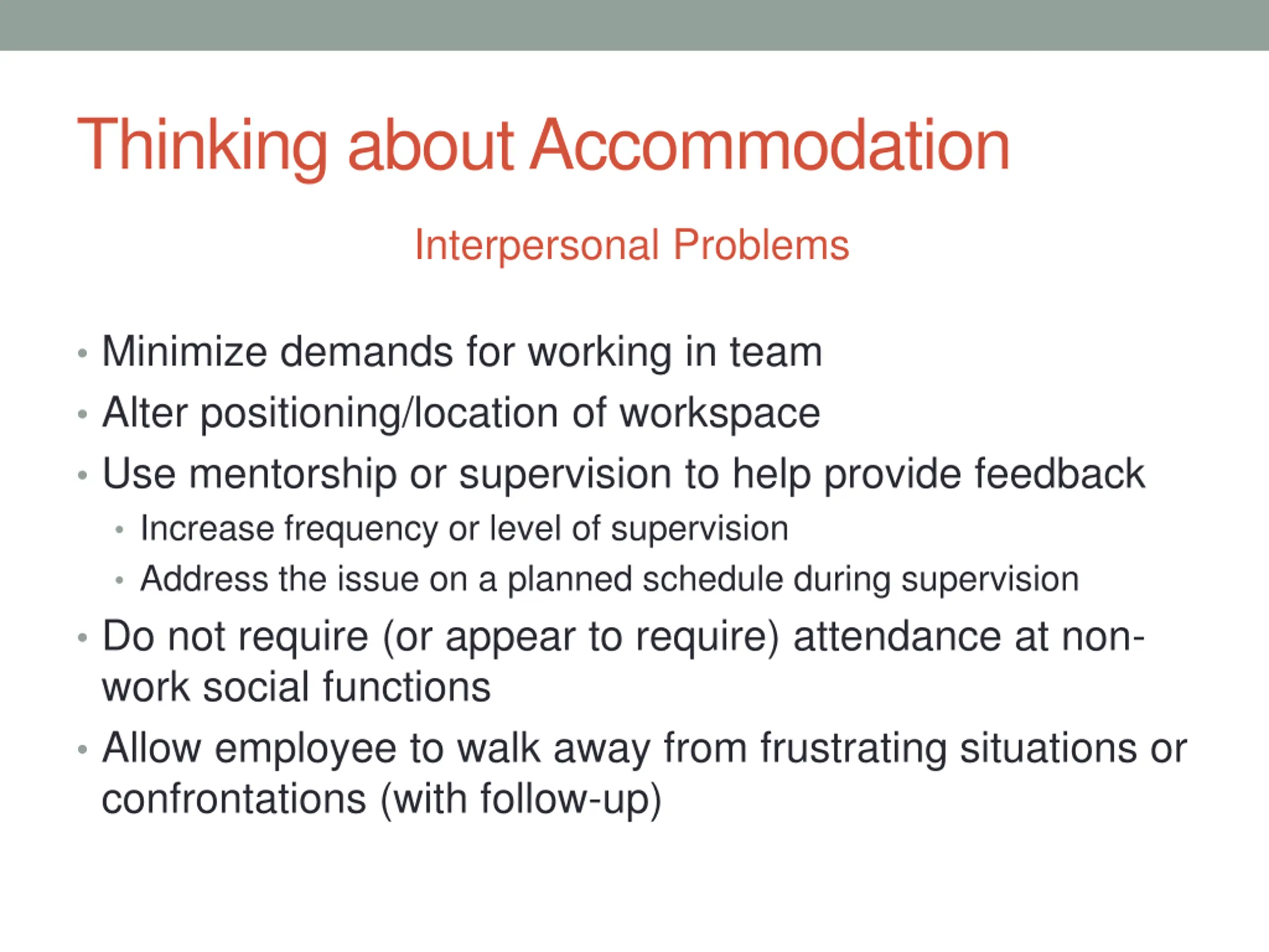 Thinking about Accommodation Interpersonal Problems Minimize demands for working in team Alter positioning/location of workspace Use mentorship or supervision to help provide feedback Increase frequency or level of supervision Address the issue on a planned schedule during supervision Do not require (or appear to require) attendance at non- work social functions Allow employee to walk away from frustrating situations or confrontations (with follow-up)
