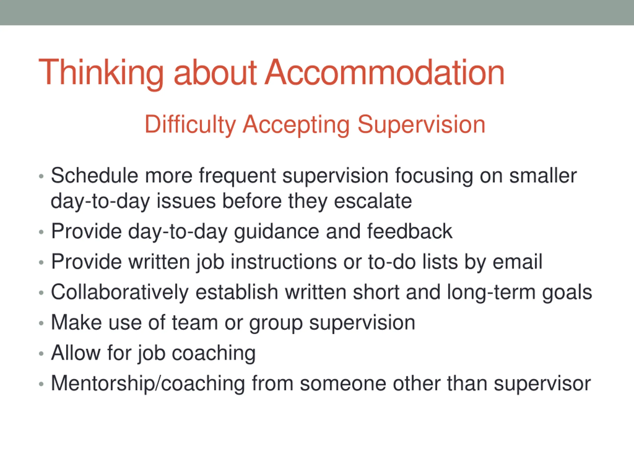 Thinking about Accommodation Difficulty Accepting Supervision Schedule more frequent supervision focusing on smaller day-to-day issues before they escalate Provide day-to-day guidance and feedback Provide written job instructions or to-do lists by email Collaboratively establish written short and long-term goals Make use of team or group supervision Allow for job coaching Mentorship/coaching from someone other than supervisor