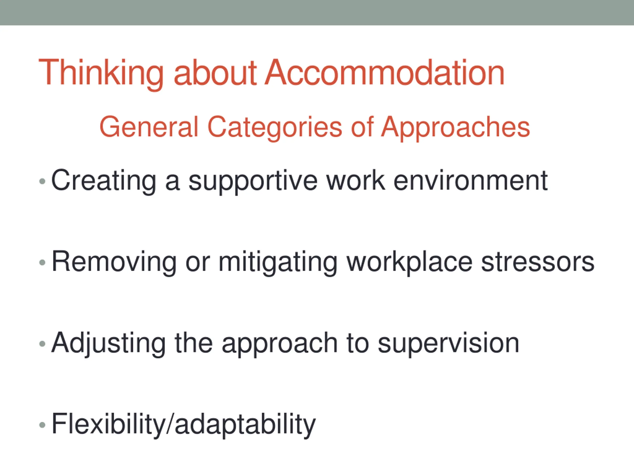 Thinking about Accommodation General Categories of Approaches Creating a supportive work environment Removing or mitigating workplace stressors Adjusting the approach to supervision Flexibility/adaptability