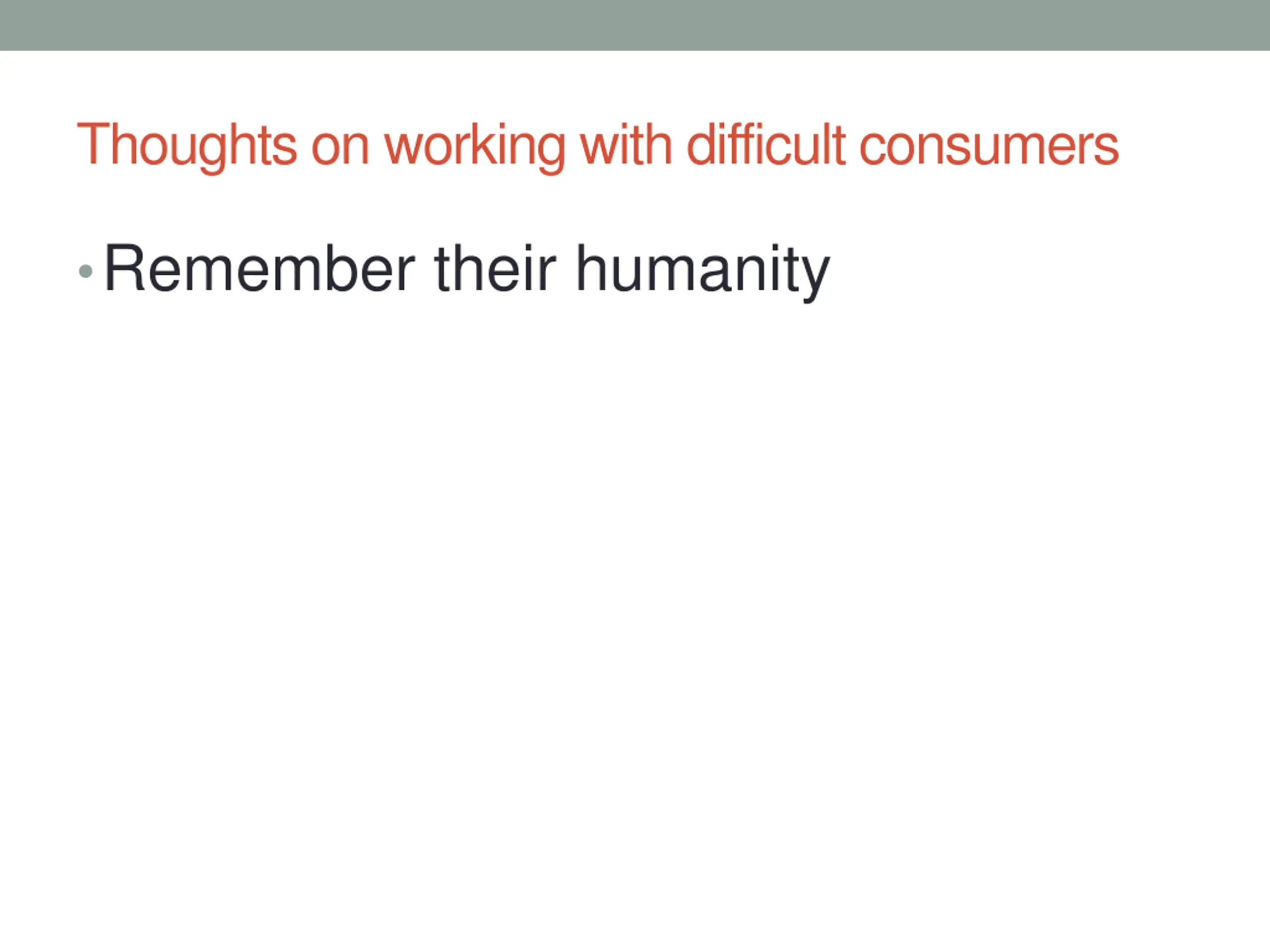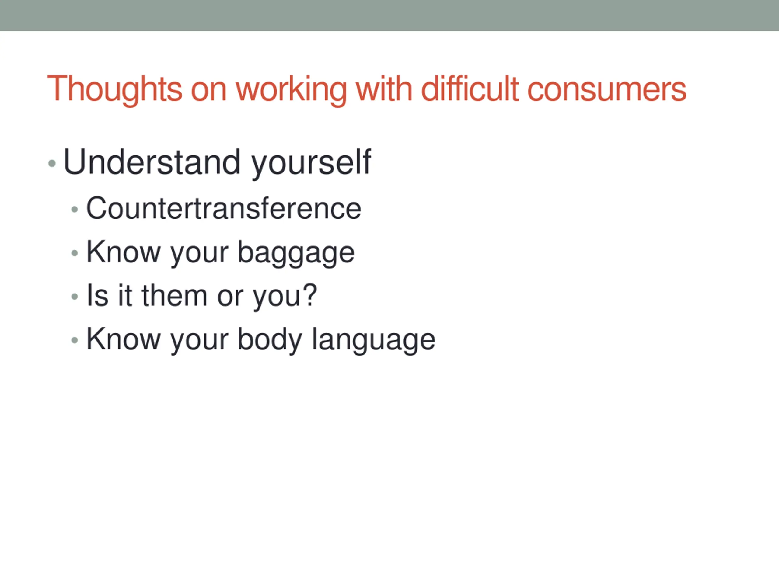 Thoughts on working with difficult consumers Understand yourself Countertransference Know your baggage Is it them or you? Know your body language