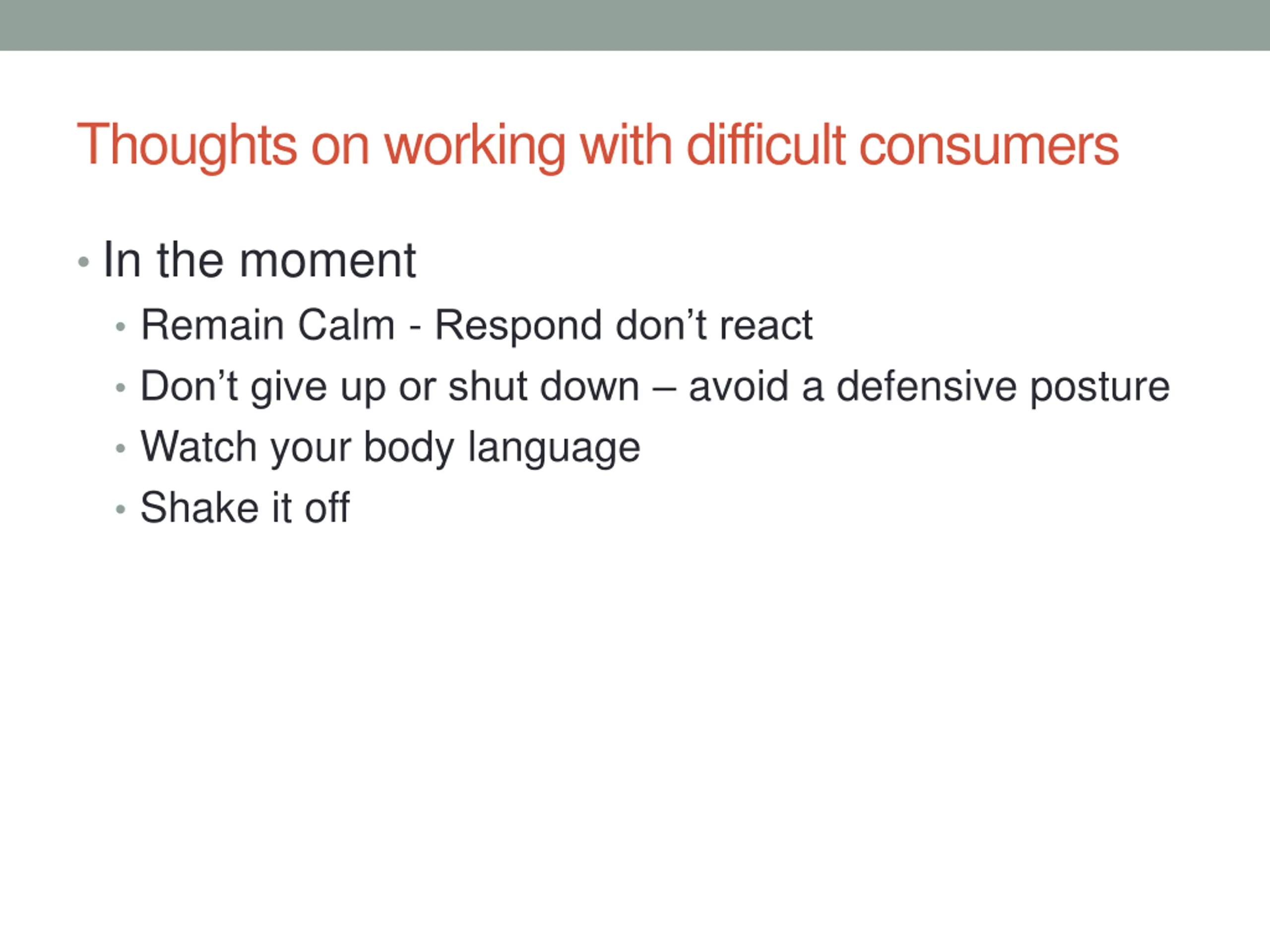 Thoughts on working with difficult consumers In the moment Remain Calm - Respond don t react Don t give up or shut down avoid a defensive posture Watch your body language Shake it off