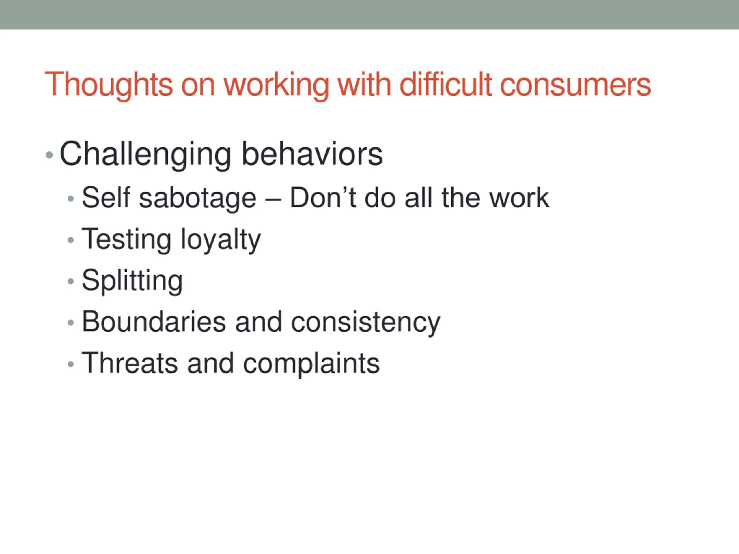 Thoughts on working with difficult consumers Challenging behaviors Self sabotage Don t do all the work Testing loyalty Splitting Boundaries and consistency Threats and complaints