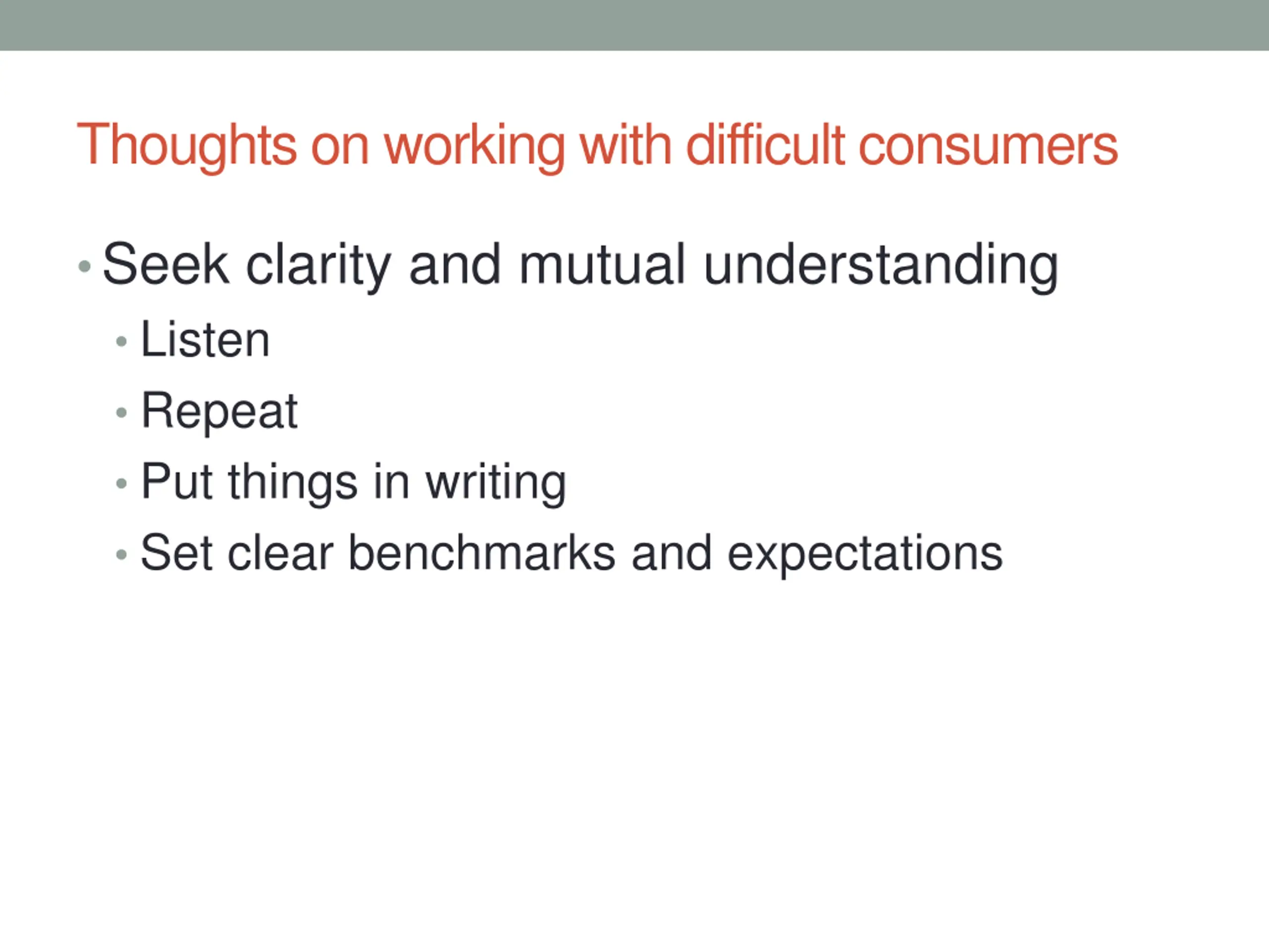 Thoughts on working with difficult consumers Seek clarity and mutual understanding Listen Repeat Put things in writing Set clear benchmarks and expectations