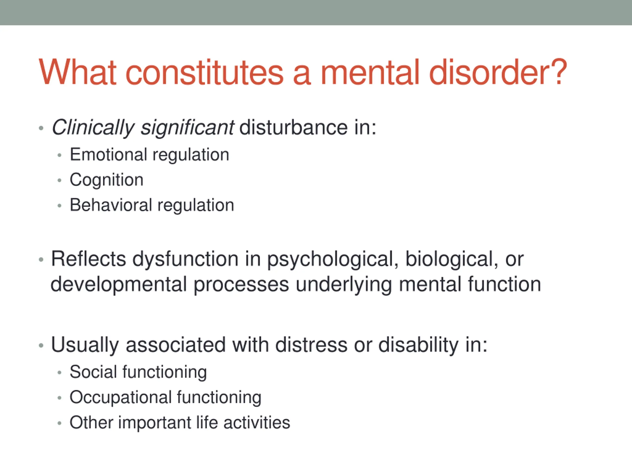 What constitutes a mental disorder? Clinically significant disturbance in: Emotional regulation Cognition Behavioral regulation Reflects dysfunction in psychological, biological, or developmental processes underlying mental function Usually associated with distress or disability in: Social functioning Occupational functioning Other important life activities