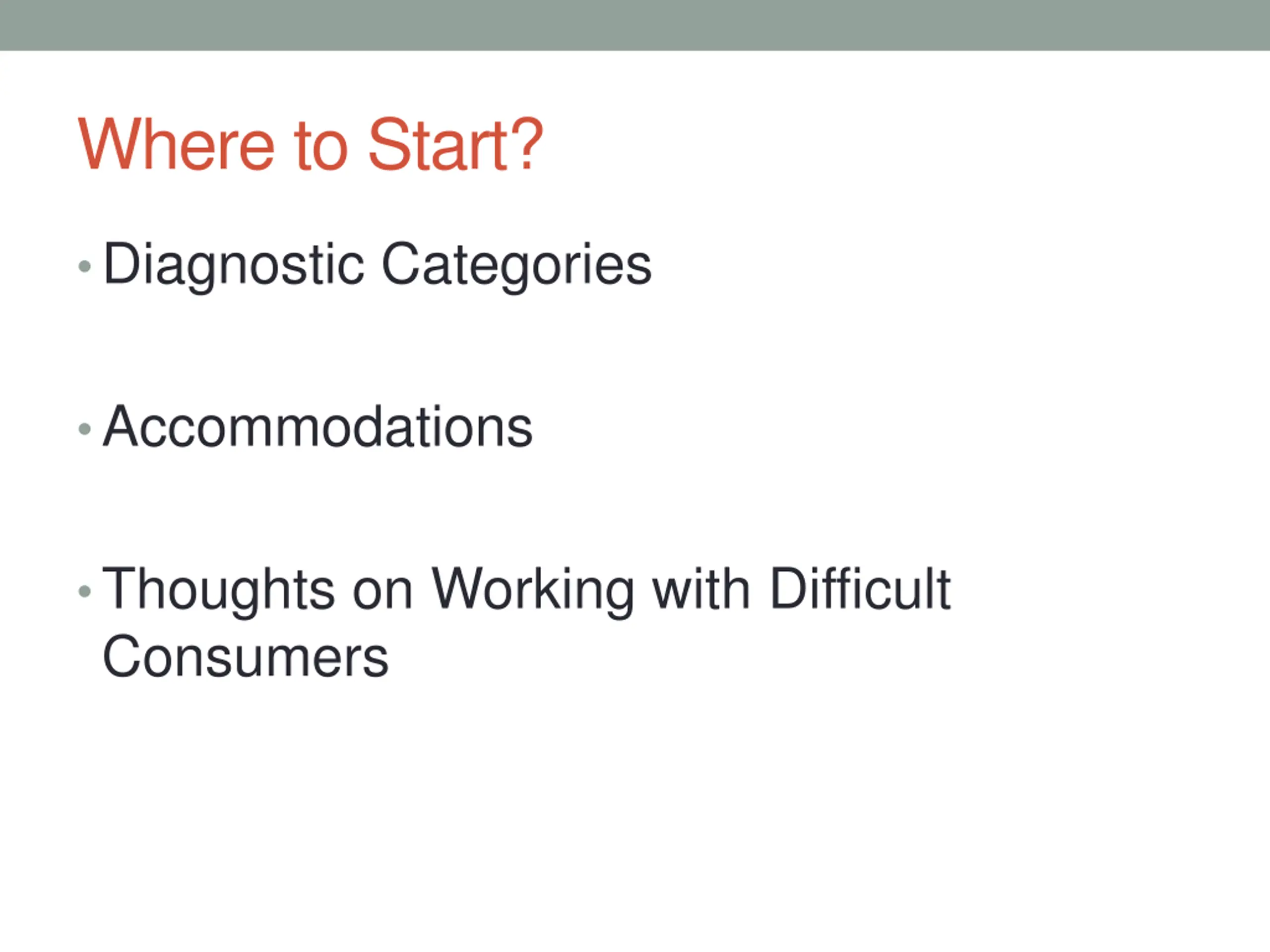 Where to Start? Diagnostic Categories Accommodations Thoughts on Working with Difficult Consumers