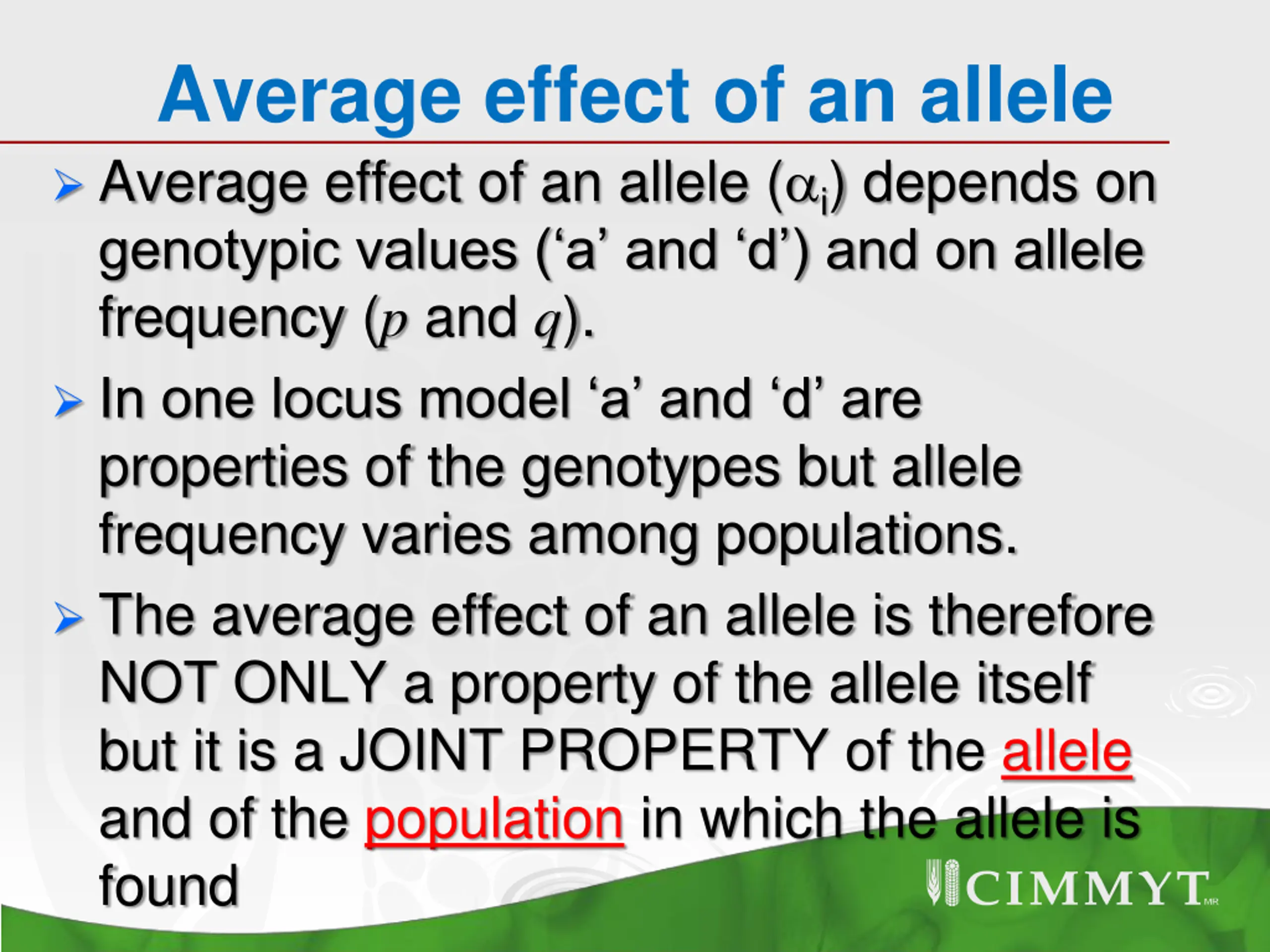 Average effect of an allele Average effect of an allele ( i) depends on genotypic values ( a and d ) and on allele frequency (p and q). In one locus model a and d are properties of the genotypes but allele frequency varies among populations. The average effect of an allele is therefore NOT ONLY a property of the allele itself but it is a JOINT PROPERTY of the allele and of the population in which the allele is found