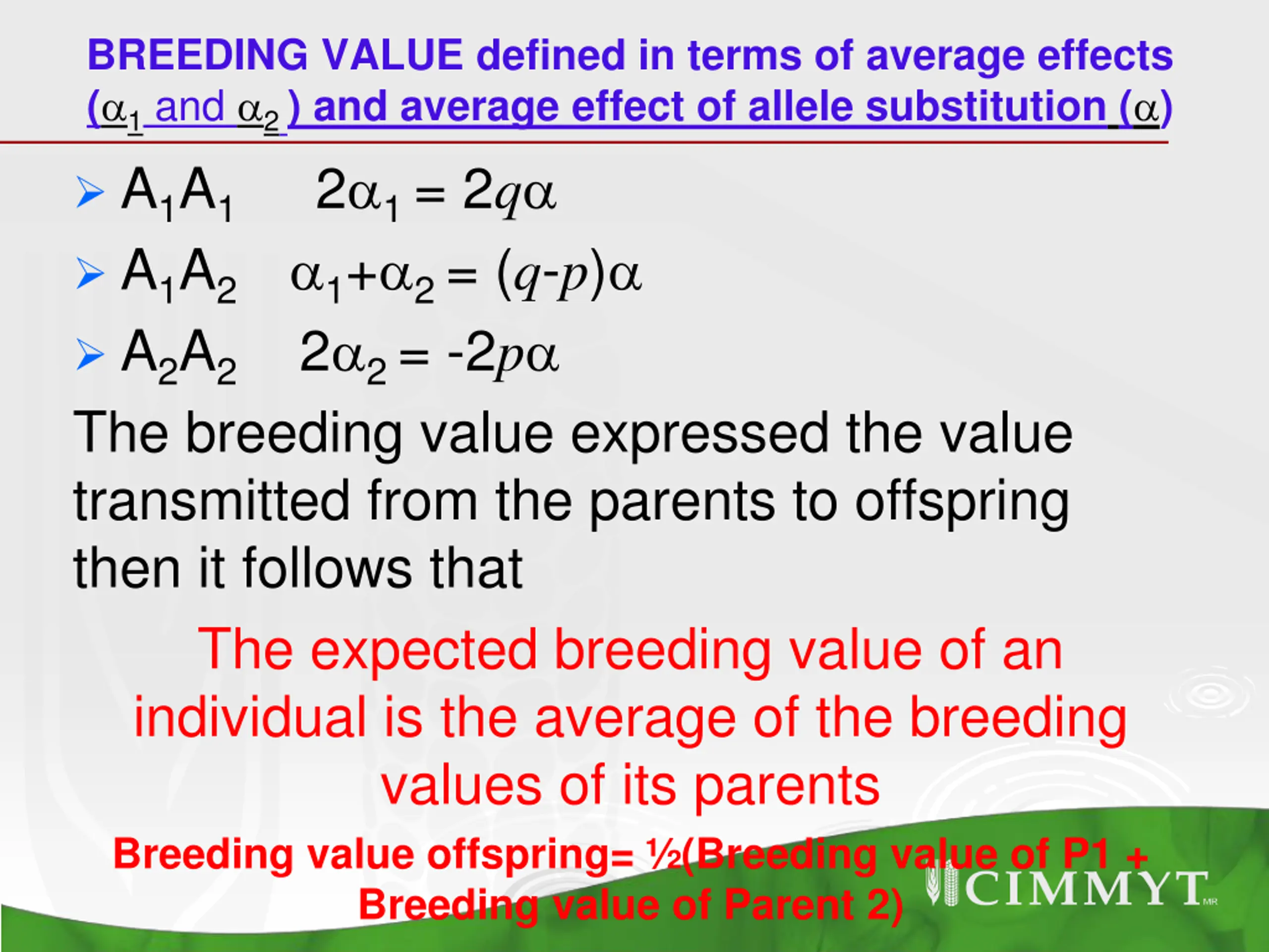 BREEDING VALUE defined in terms of average effects ( 1and 2) and average effect of allele substitution ( ) A1A1 2 1 = 2q A1A2 1+ 2 = (q-p) A2A2 2 2 = -2p The breeding value expressed the value transmitted from the parents to offspring then it follows that The expected breeding value of an individual is the average of the breeding values of its parents Breeding value offspring= (Breeding value of P1 + Breeding value of Parent 2)