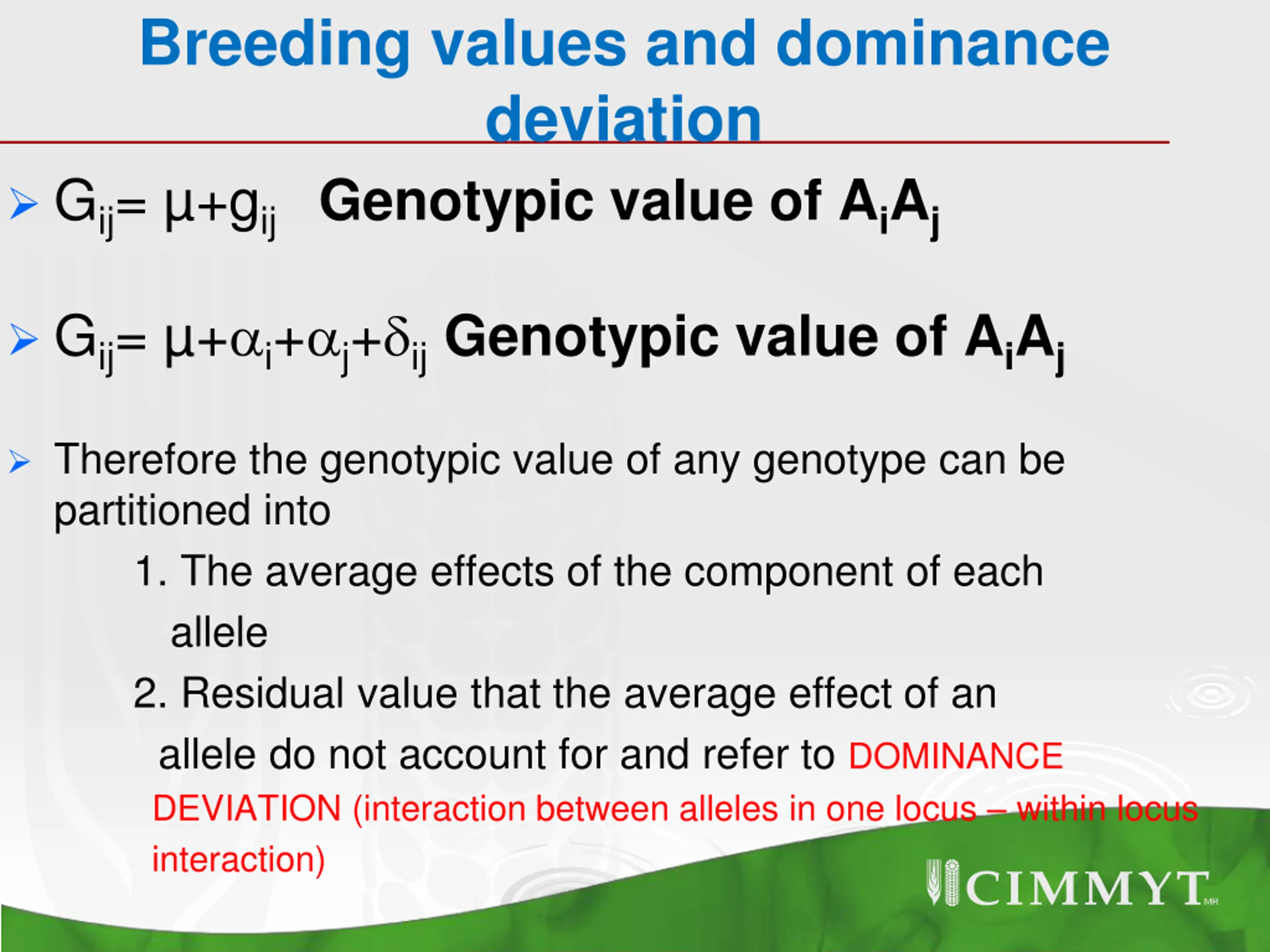 Breeding values and dominance deviation Gij= +gij Genotypic value of AiAj Gij= + i+ j+ ijGenotypic value of AiAj Therefore the genotypic value of any genotype can be partitioned into 1. The average effects of the component of each allele 2. Residual value that the average effect of an allele do not account for and refer to DOMINANCE DEVIATION (interaction between alleles in one locus within locus interaction)